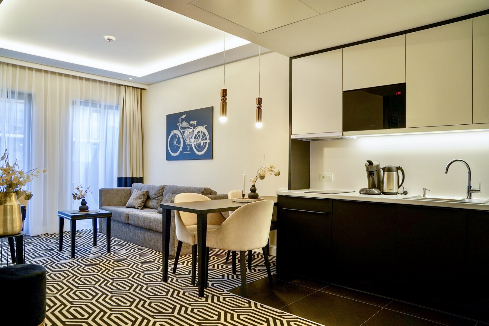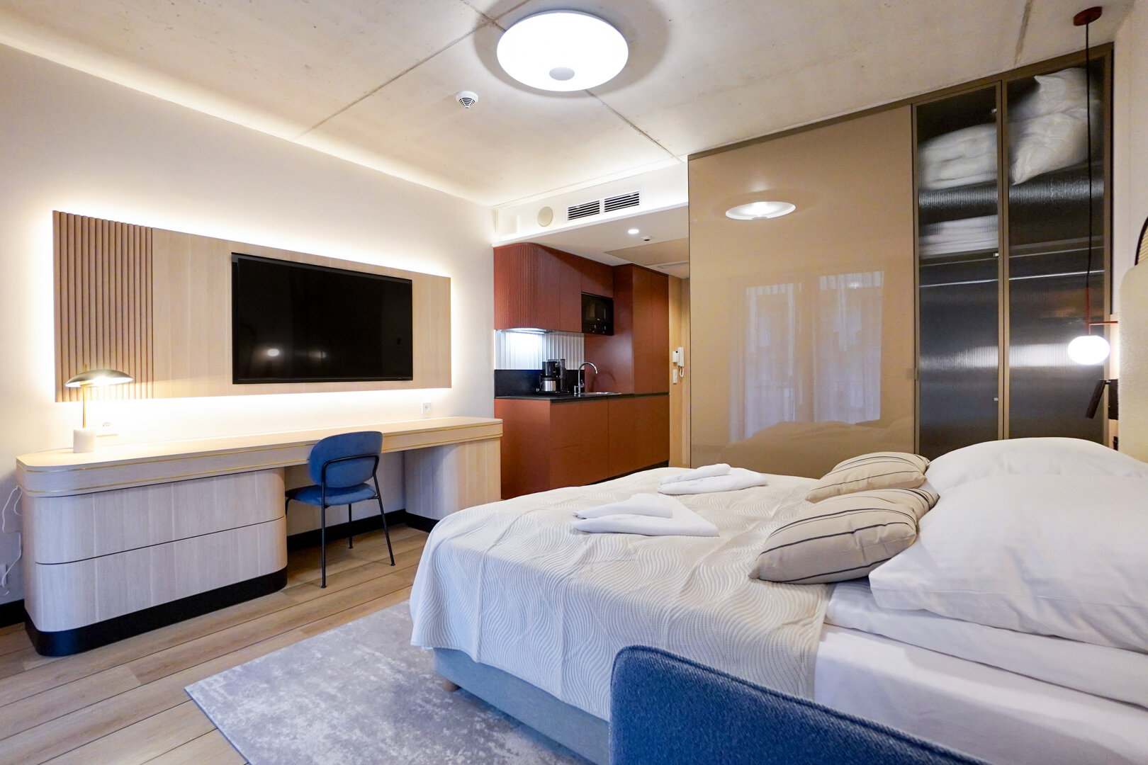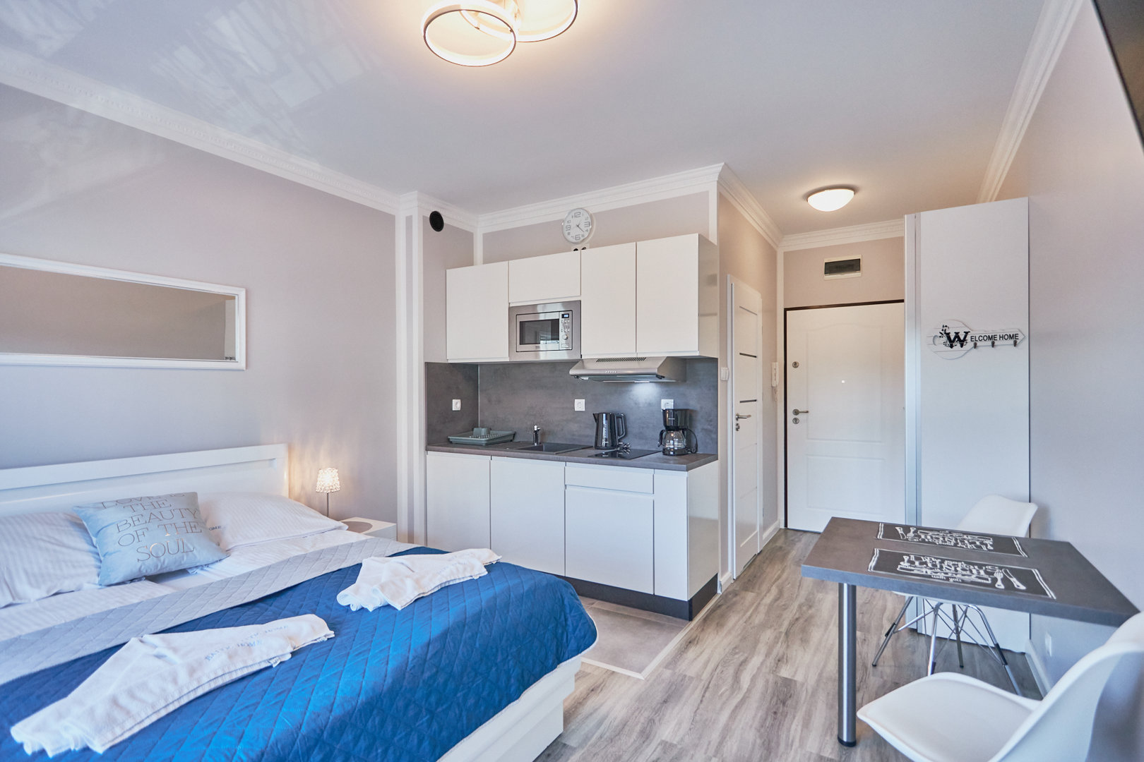 W każdym z naszych apartamentów znajduje się wygodne łóżko, w pełni wyposażony aneks kuchenny oraz prywatna łazienka. Szczegóły udogodnień w poszczególnych apartamentach znaleźć można na naszej stronie internetowej. W przypadku bardziej szczegółowych informacji zachęcamy do kontaktu mailowego lub telefonicznego.