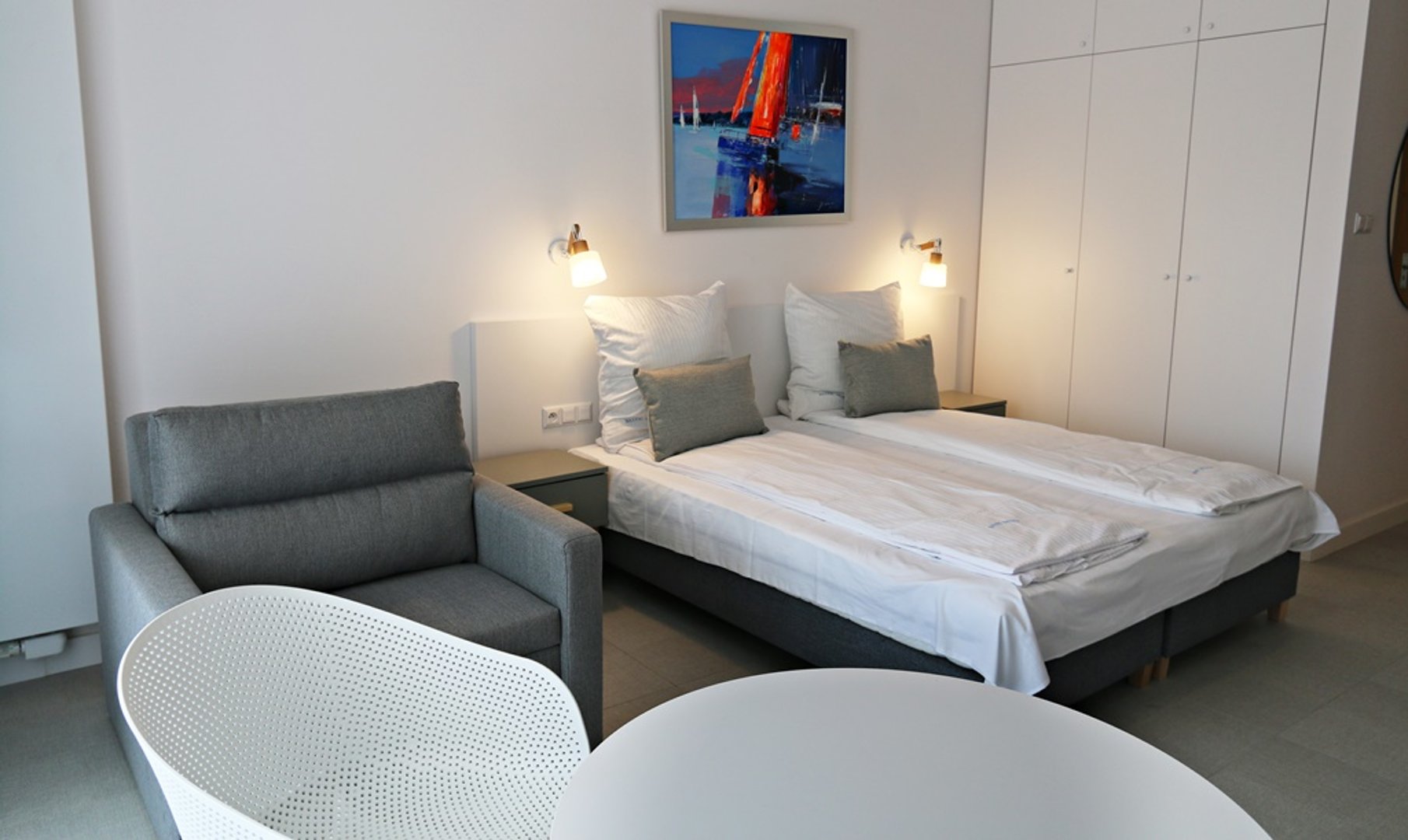 * salonu z łóżkiem małżeńskim wraz z kanapą przeznaczoną dla jednej osoby z funkcją spania
