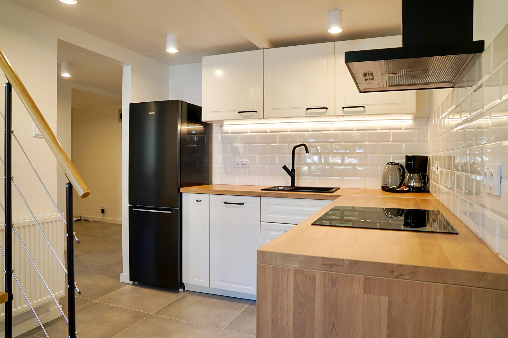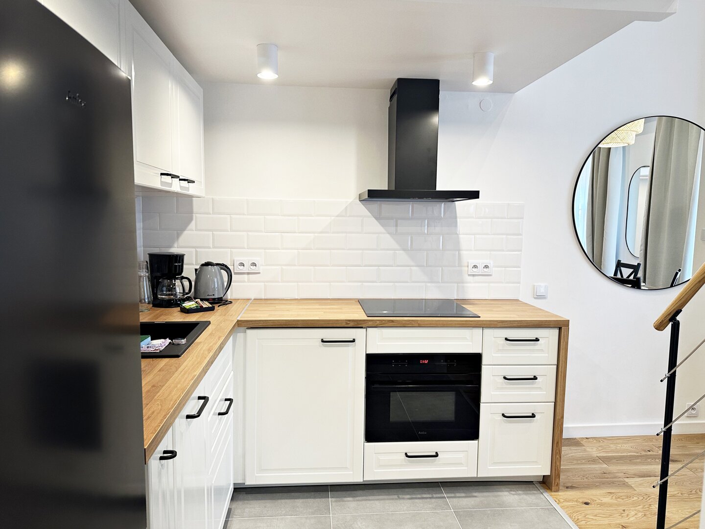 Aneks kuchenny – w pełni wyposażony w nowoczesny sprzęt AGD, w tym płytę indukcyjną, piekarnik, zmywarkę,ekspres do kawy oraz elegancką zastawę stołową.Obok znajduje się duży stół jadalniany, przy którym można wspólnie celebrować posiłki.