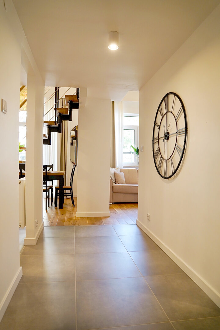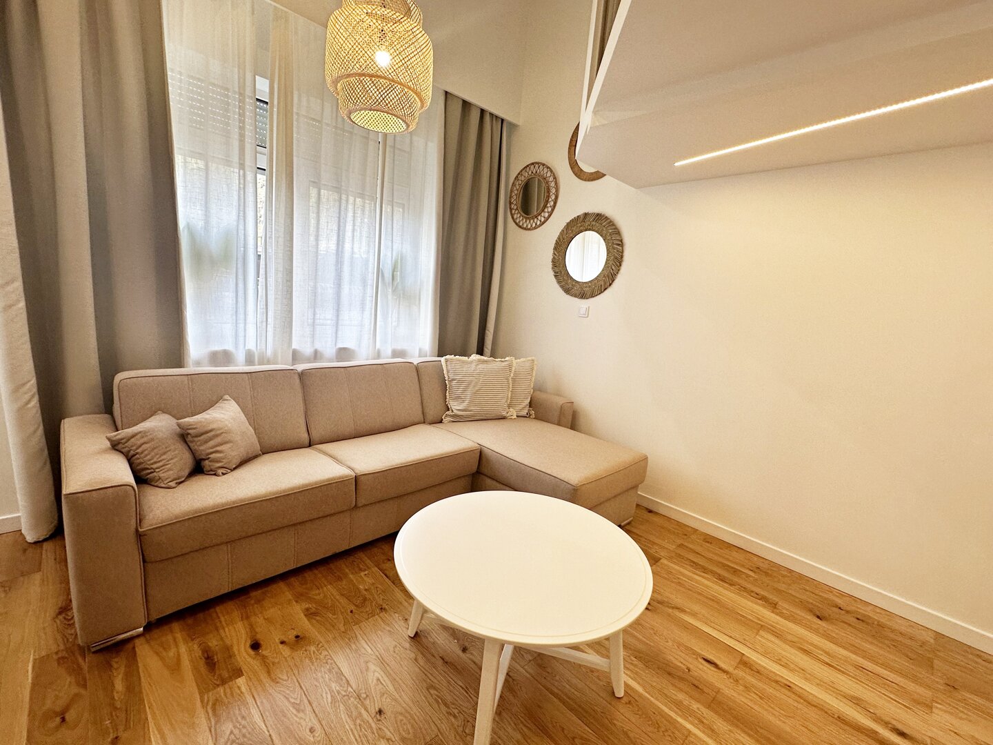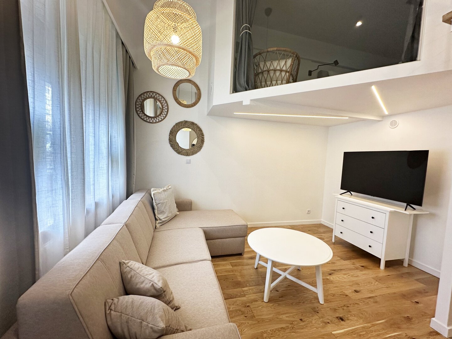 Salon – przestronny i jasny, wyposażony w rozkładaną sofę dla dwóch osób, nowoczesny telewizor oraz stylowe dodatki, które podkreślają luksusowy charakter wnętrza. Dzięki wysokim sufitom i dużym oknom salon jest doskonale doświetlony, a nowoczesne oświetlenie dodaje mu przytulności.Wysokie sufity i lustra w stylu boho, rozmieszczone na ścianach,optycznie powiększają przestrzeń i dodają wnętrzu lekkości.