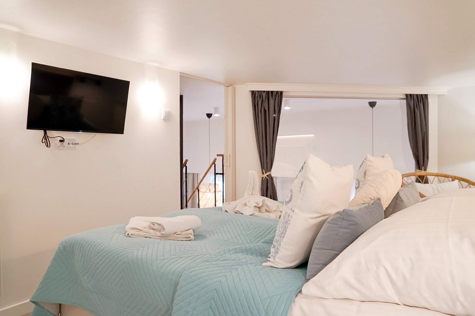 Na piętrze mieszczą się dwie komfortowe sypialnie, każda z łóżkiem małżeńskim, klimatycznym oświetleniem i dużymi szafami z lustrami .W każdej sypialni znajduję się TV .W sypialniach dominują jasne barwy, naturalne materiały i subtelne dekoracje, które wpisują się w stylistykę boho oraz nadają przestrzeni nadmorski klimat