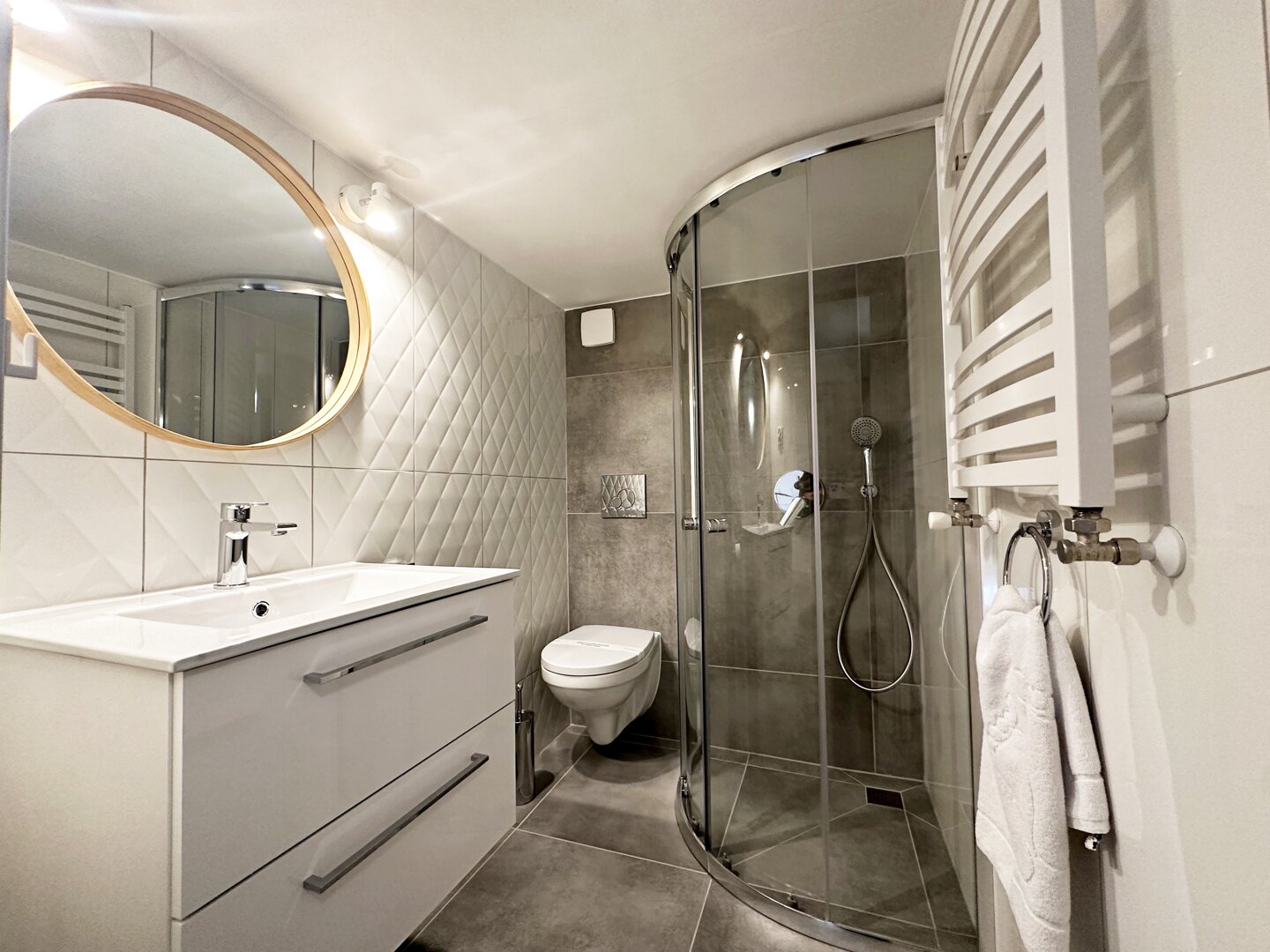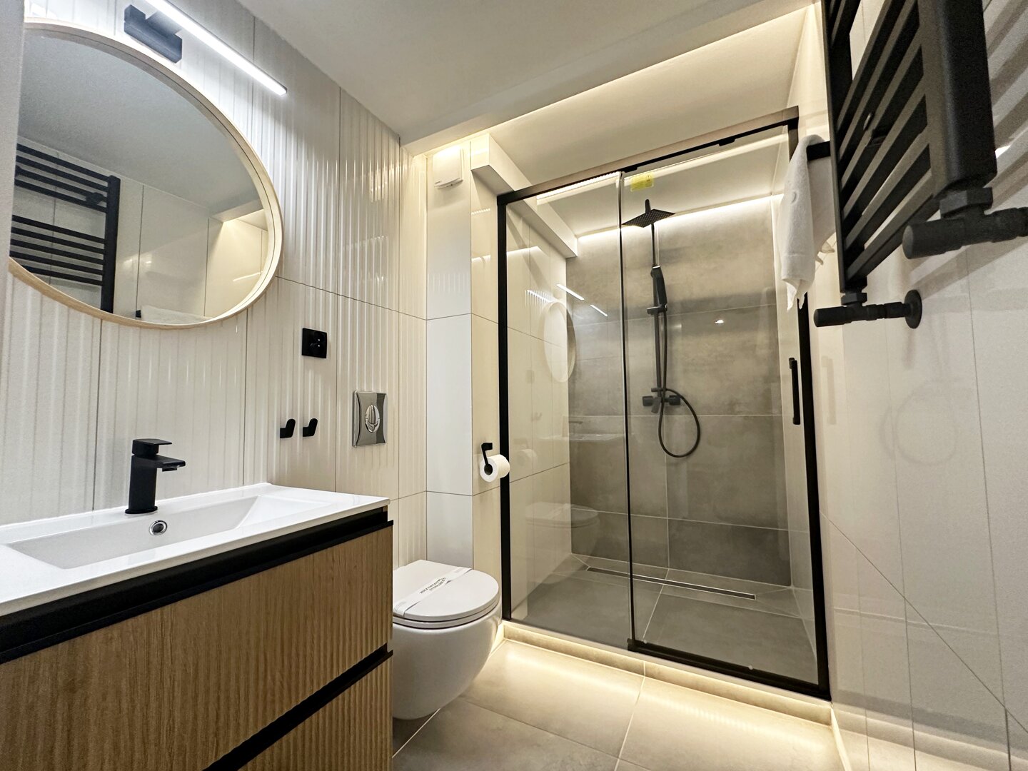 Dodatkowa łazienka w apartamencie to niezwykle praktyczne udogodnienie, które zapewnia wygodę i swobodę wszystkim gościom. Bezprogowa kabina prysznicowa – nowoczesna i przestronna, wyposażona w deszczownicę, eleganckie szklane drzwi oraz wysokiej jakości armaturę, co zapewnia maksymalny komfort podczas kąpieli.Umywalka z dużym lustrem – stylowa i funkcjonalna, z wygodną przestrzenią na kosmetyki. Podświetlane lustro optycznie powiększa wnętrze, dodając mu elegancji i nowoczesnego charakteru.
