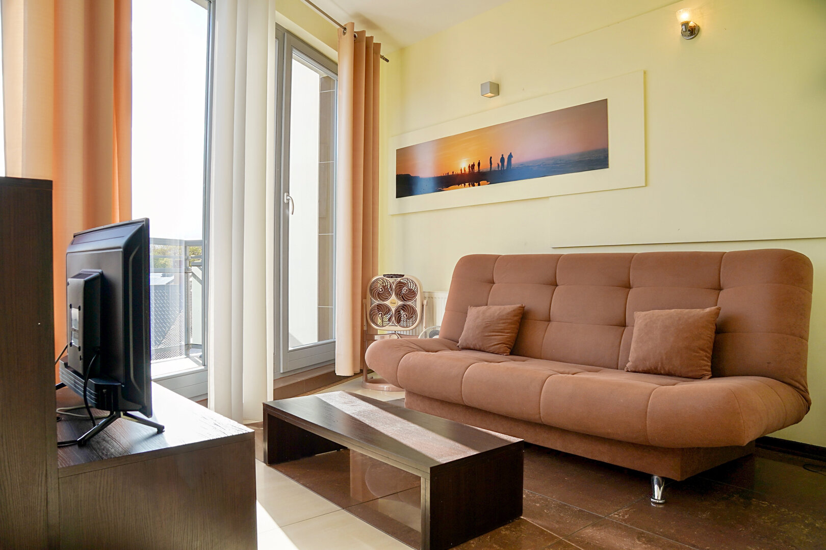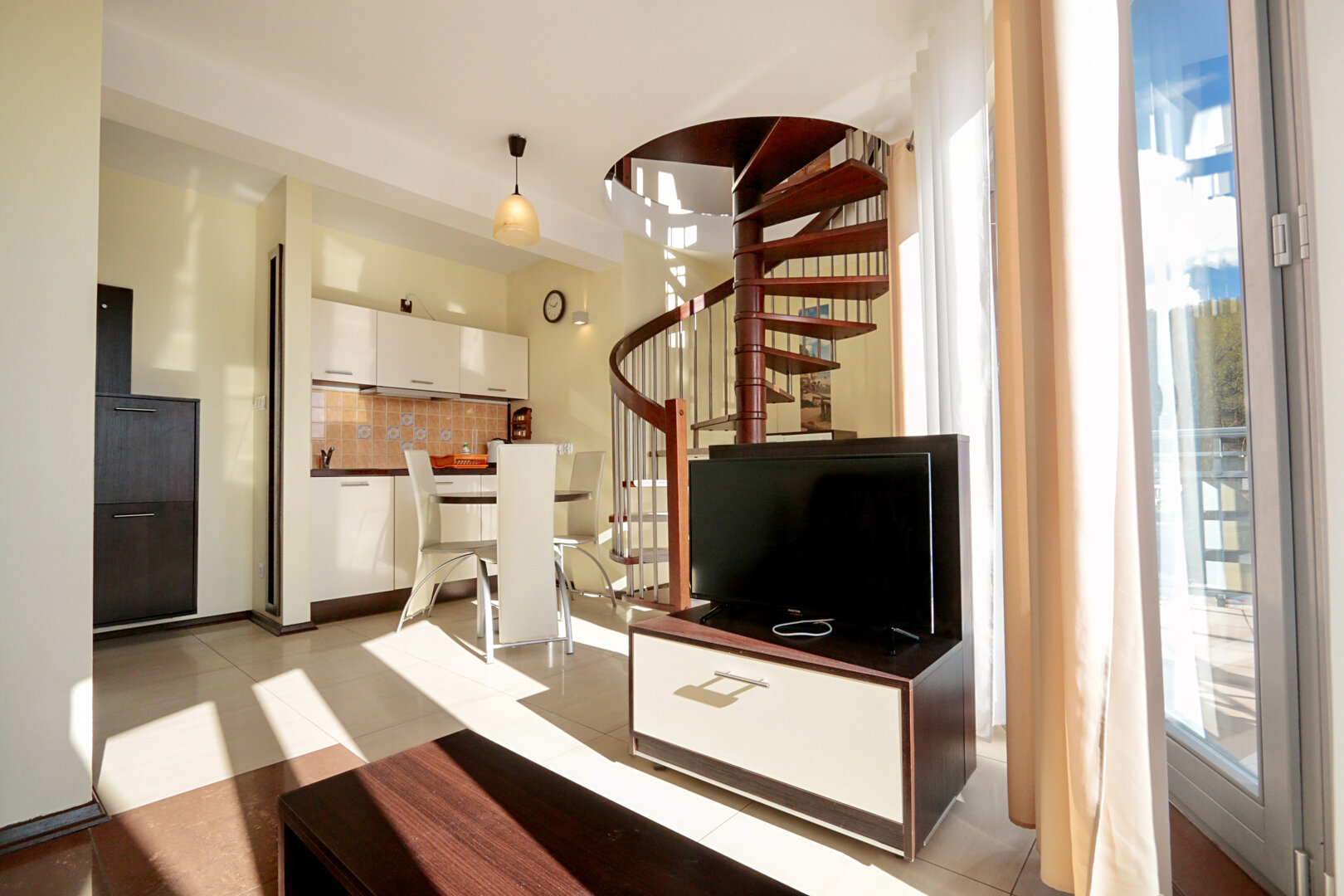 Apartament usytuowany jest na 4 piętrze od strony południowo zachodniej.Rozkład pomieszczeń umożliwia wypoczynek maksymalnie dla 3 osób. Na pierwszej kondygnacji znajduje się salon z wyposażonym w podstawowe akcesoria kuchenne aneks oraz balkon.