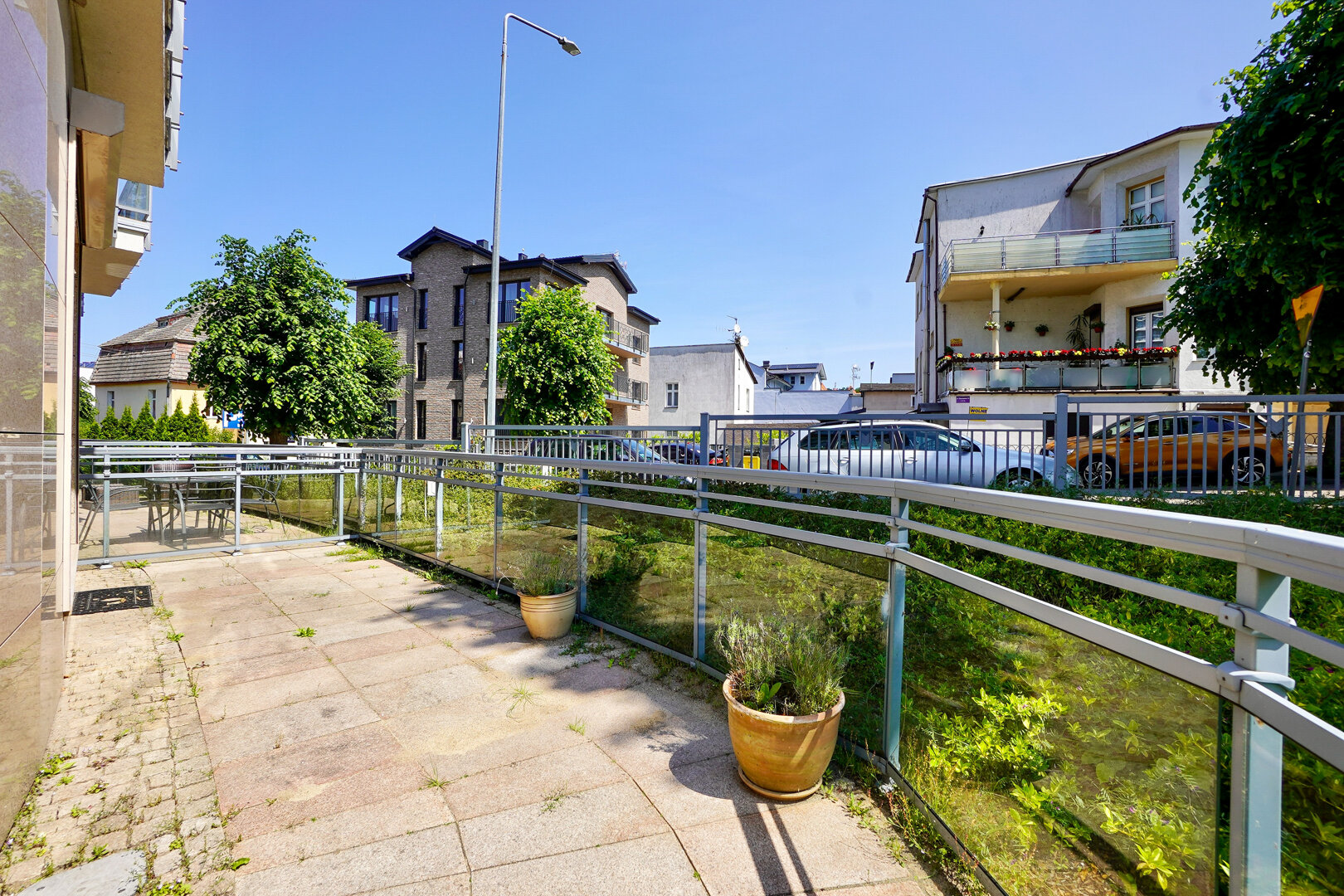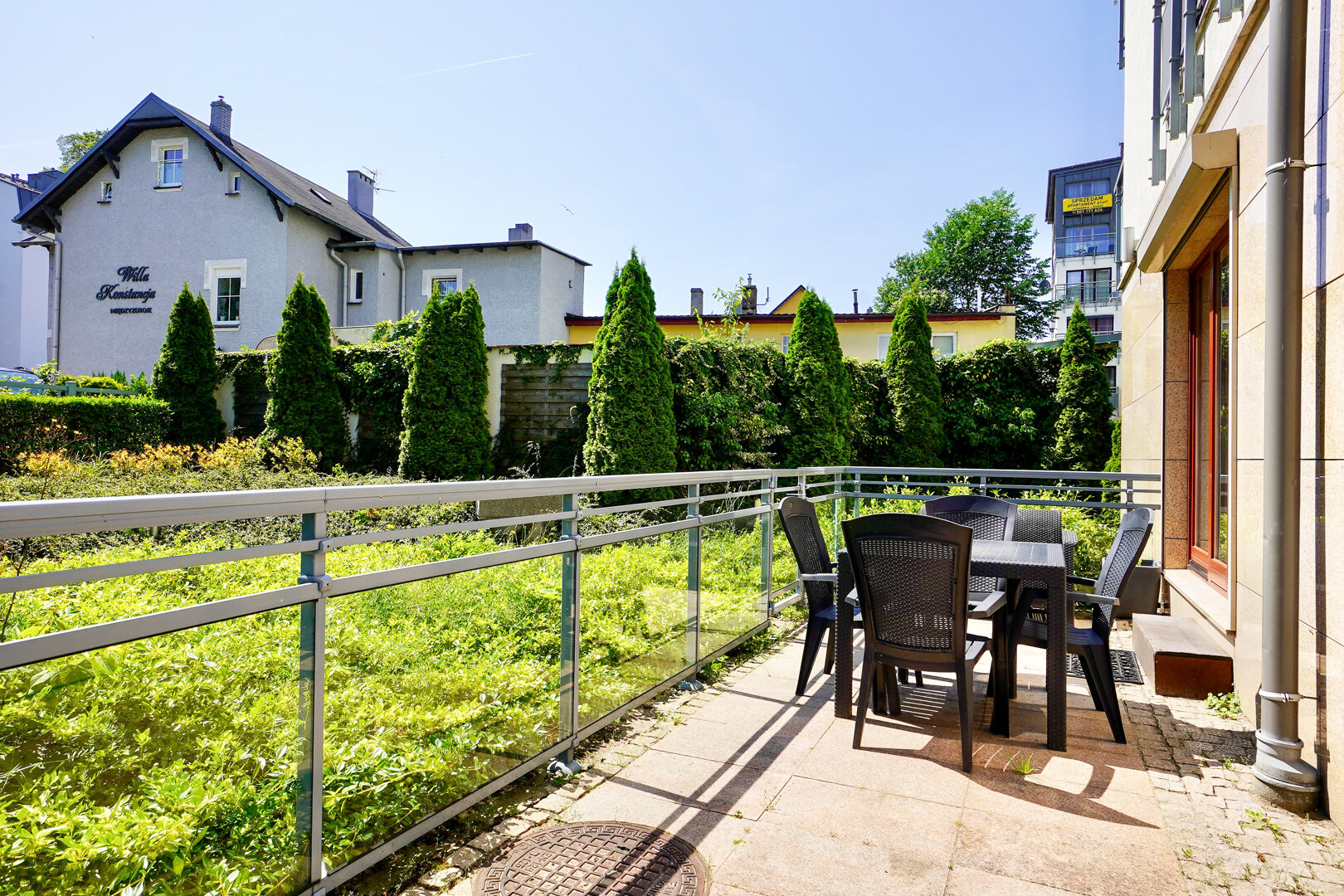 Apartament wyposażony jest w przestronny taras, który stanowi idealne miejsce do relaksu i spędzania czasu na świeżym powietrzu. Taras został elegancko zaaranżowany i wyposażony w wygodne meble tarasowe, takie jak stół z krzesłami, które umożliwiają komfortowe spożywanie posiłków na zewnątrz lub wypoczynek w otoczeniu natury.