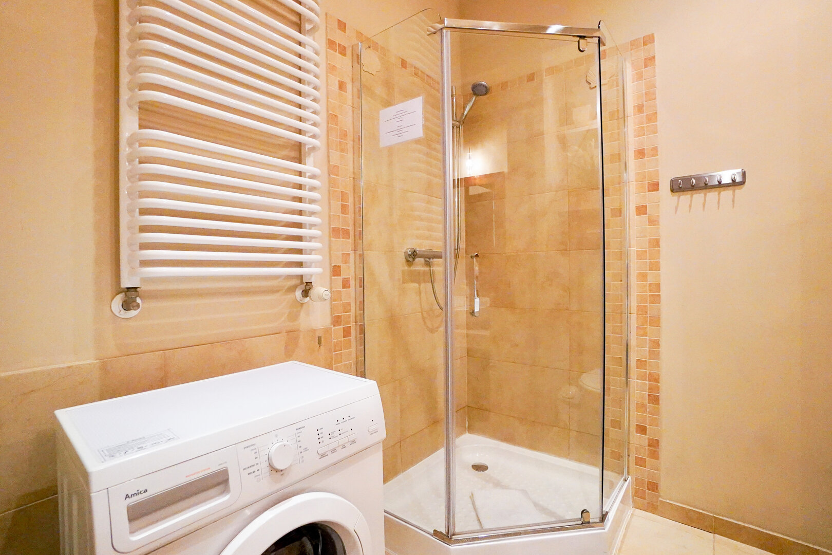 Łazienka została zaprojektowana z myślą o wygodzie, gdyż mieści w sobie kabinę prysznicową oraz pralkę, niezbędną przy dłuższych pobytach.