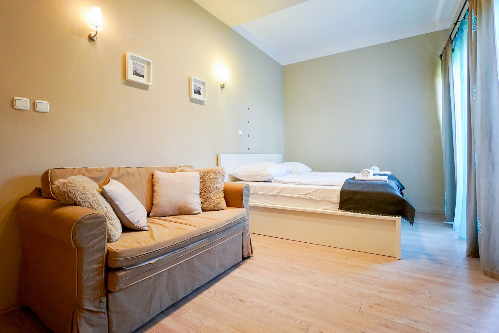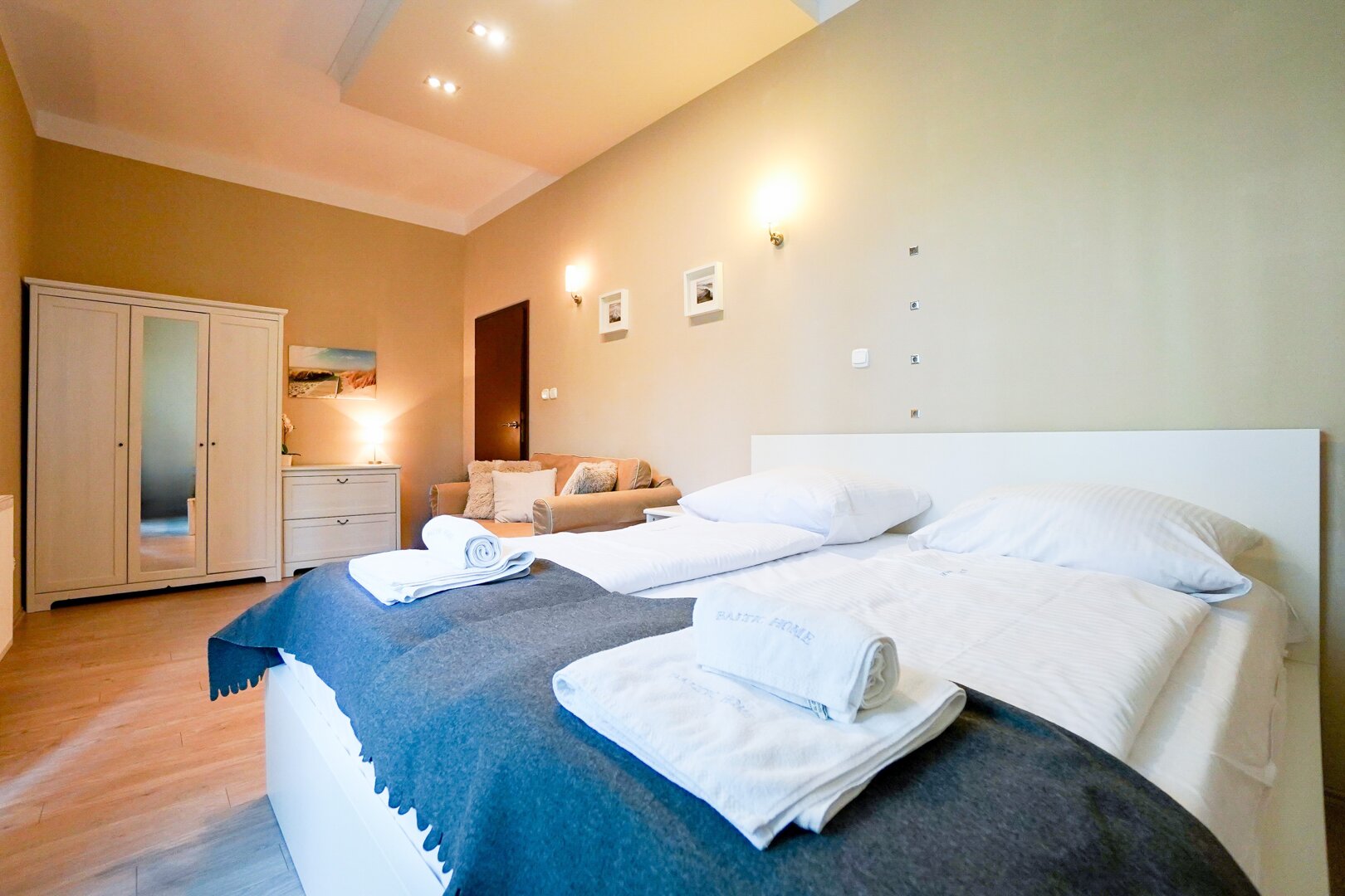 Sypialnia została wyposażona w duże łóżko małżeńskie z wygodnym materacem, które gwarantują spokojny sen. W pomieszczeniu znajduje się również kanapa jednoosobowa, która pełni funkcję zarówno miejsca do spania, jak i relaksu w ciągu dnia. Wystrój sypialni jest utrzymany w jasnych, stonowanych barwach, które sprzyjają wypoczynkowi, a dodatkowe dekoracje, takie jak obrazy na ścianach czy stylowe oświetlenie, tworzą przytulną atmosferę.W sypialni znajduje się również pojemna szafa z lustrem, która umożliwia wygodne przechowywanie ubrań i innych rzeczy osobistych.