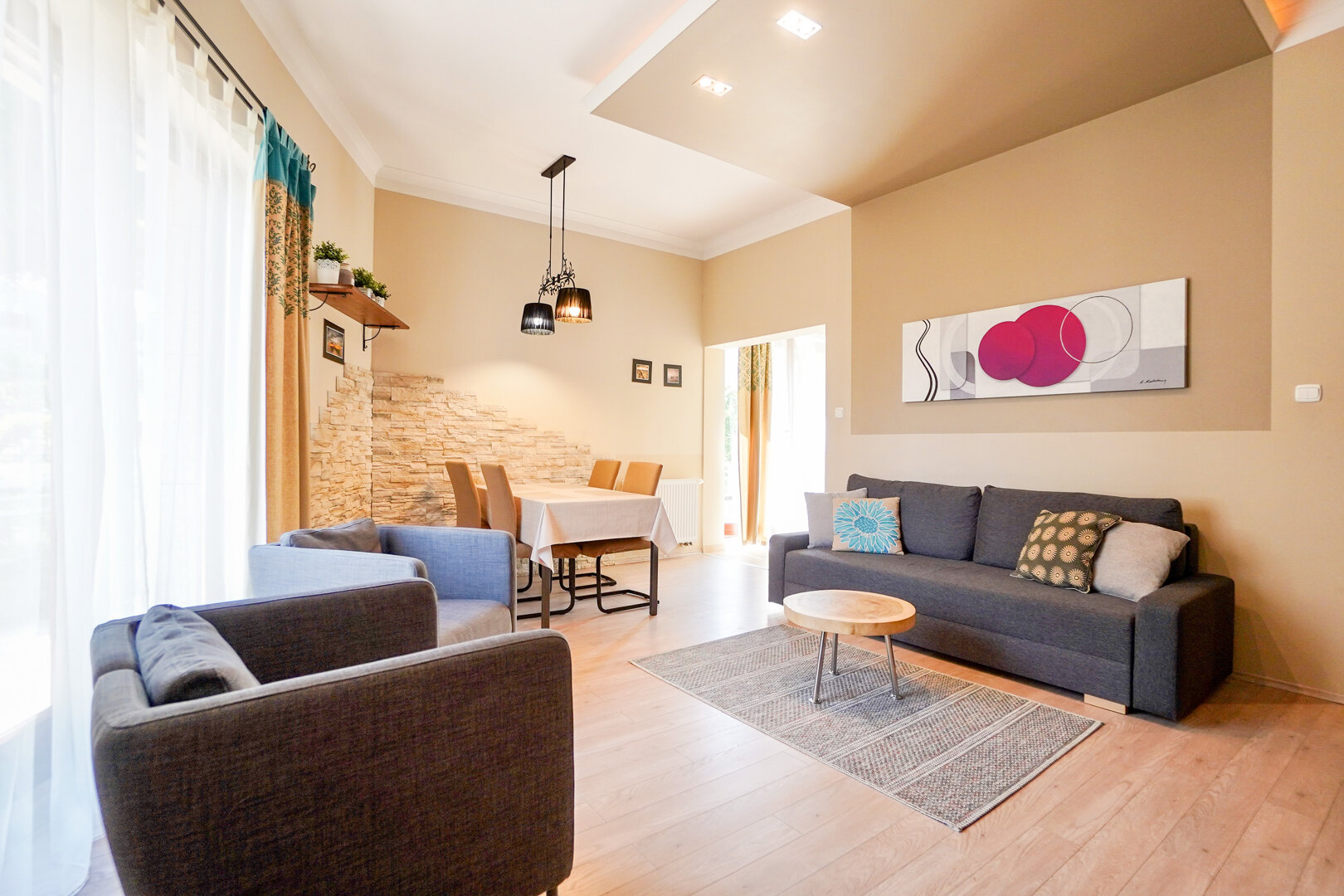 Dzięki przemyślanemu układowi pomieszczeń apartament jest idealnym rozwiązaniem dla rodzin lub grup przyjaciół, oferując przestrzeń zarówno do wspólnego spędzania czasu, jak i prywatności.