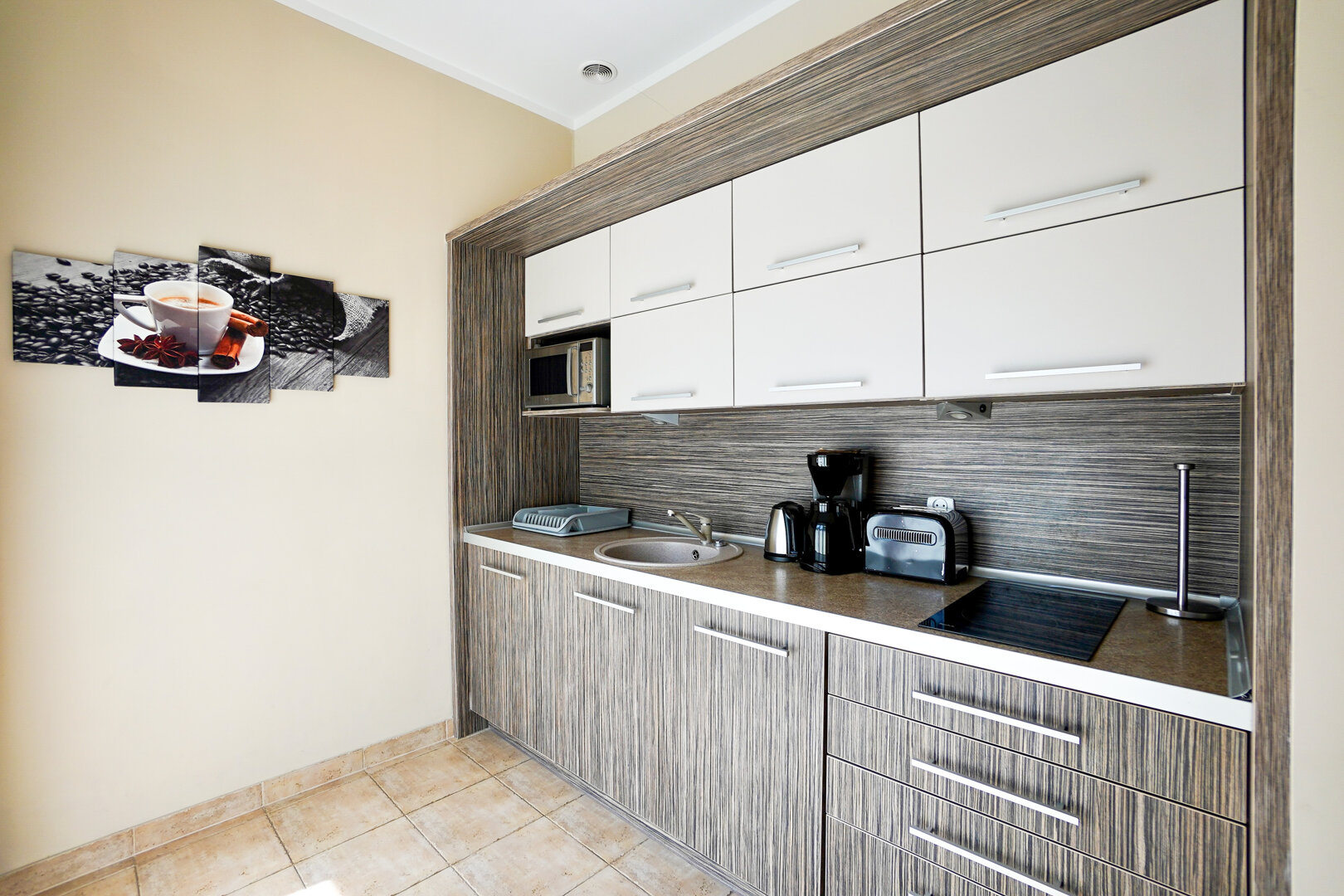 Salon apartamentu jest otwarty i przestronny, wyposażony w rozkładaną kanapę, która może pomieścić dwie osoby na nocleg. Znajduje się tu również stół jadalniany z krzesłami, a kompaktowy aneks kuchenny jest wyposażony we wszystkie niezbędne sprzęty, takie jak lodówka, płyta grzewcza, czajnik elektryczny oraz zestaw naczyń.