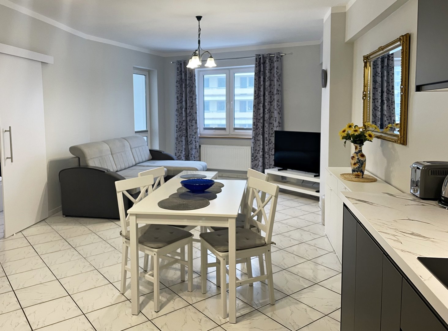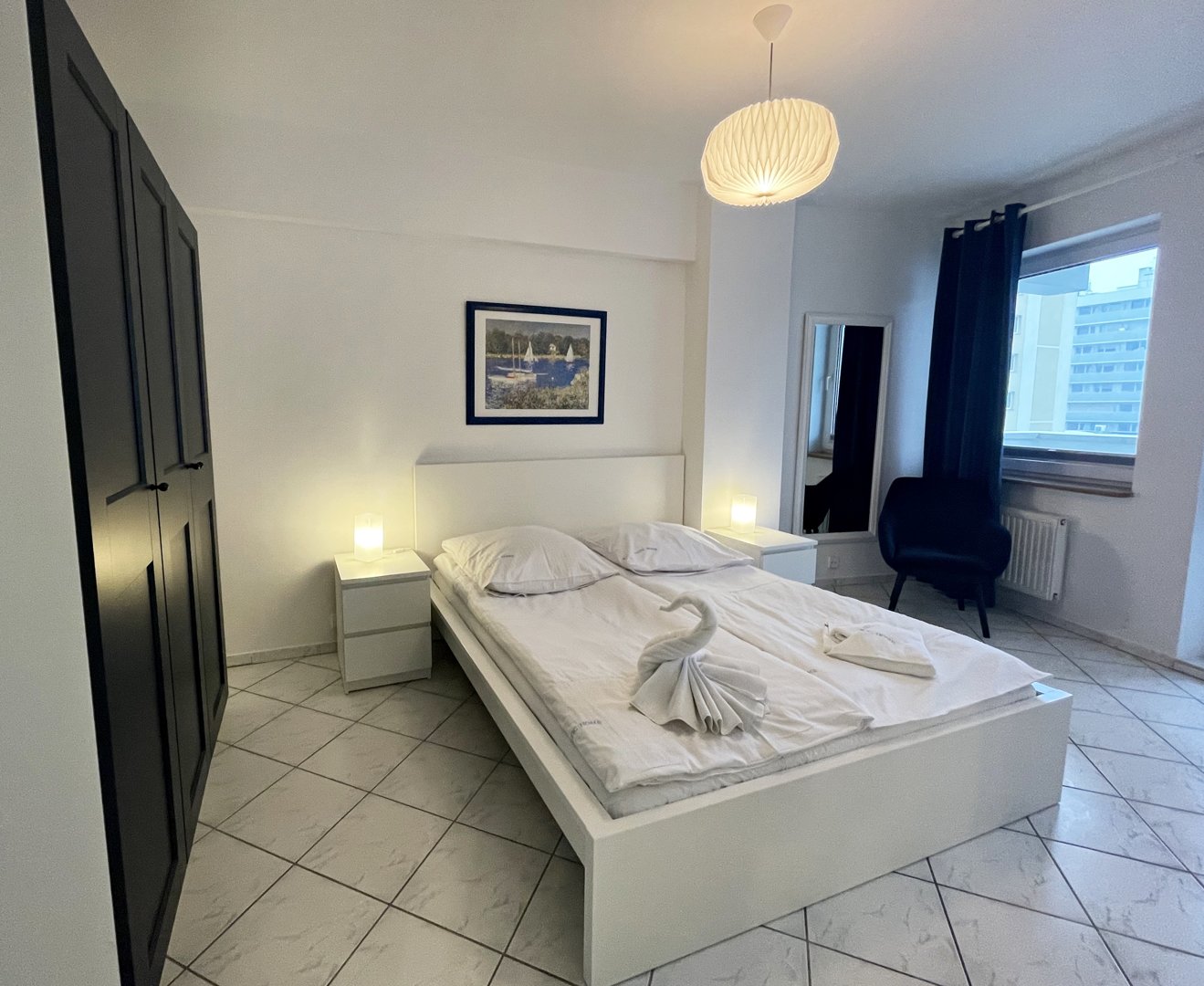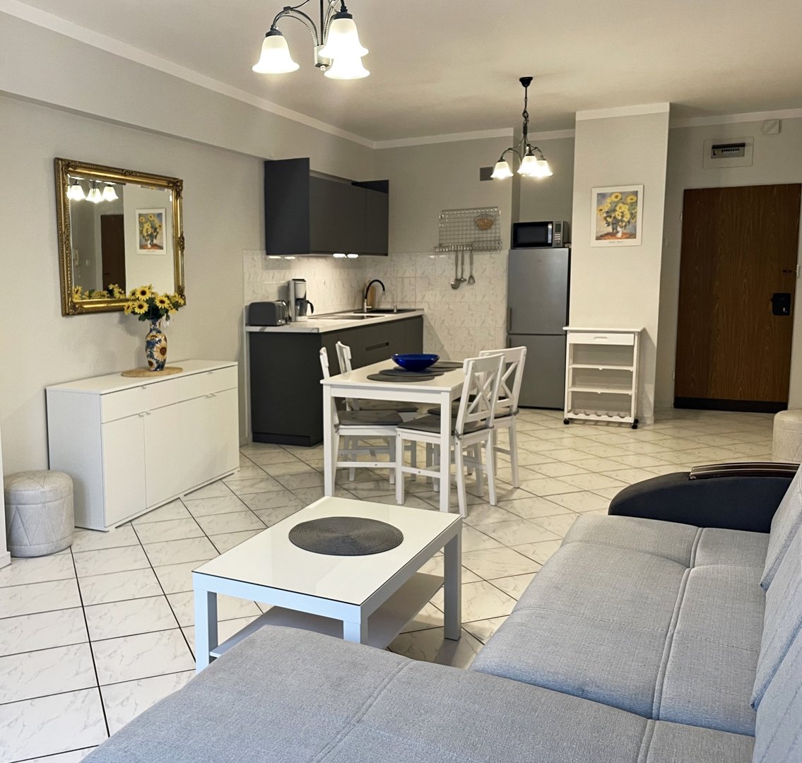 Zapraszamy do komforotowego Apartamentu, gdzie do dyspozycji gości jest przestronny salon połączony z aneksem kuchennym z dużym stołem jadalnianym. W lokalu znajduje się przytulna sypialnia z pojemną szafą na ubrania. Apartament posiada bardzo ładny balkon z częściowym widokiem na morze. Dodatkowym atutem tego mieszkania jest łazienka z wygodną wanną. Zapraszamy!