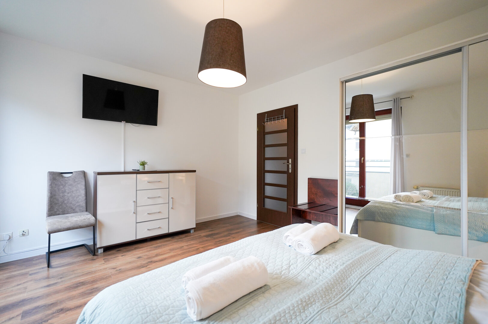 Osobna, jasna sypialnia została zaprojektowana z myślą o komforcie gości. Centralnym elementem wnętrza jest wygodne łóżko małżeńskie, zapewniające komfortowy wypoczynek. W sypialni znajduje się duża szafa z lustrem oraz praktyczna komoda, które oferują dużo miejsca do przechowywania ubrań i osobistych rzeczy. Dodatkowo w pomieszczeniu zamontowany jest telewizor, co pozwala na relaks i oglądanie programów lub filmów bez wychodzenia ze sypialni.Całość utrzymana jest w jasnej, przyjemnej kolorystyce, tworząc przytulną i funkcjonalną przestrzeń sprzyjającą odpoczynkowi.