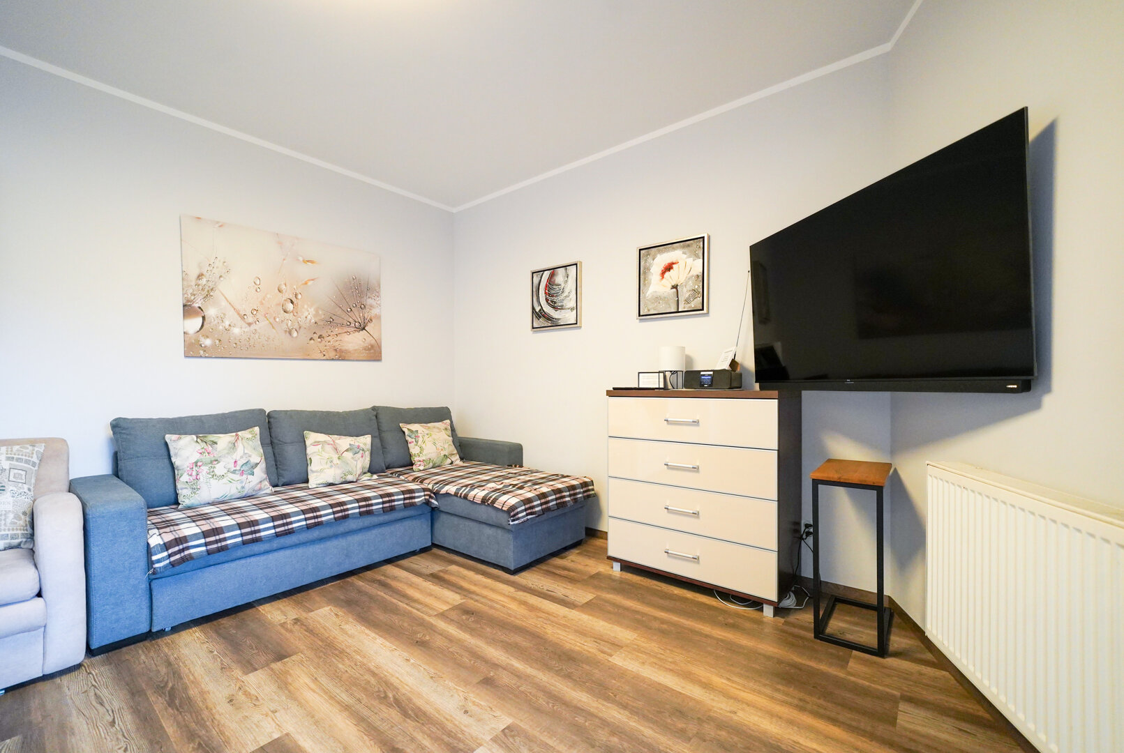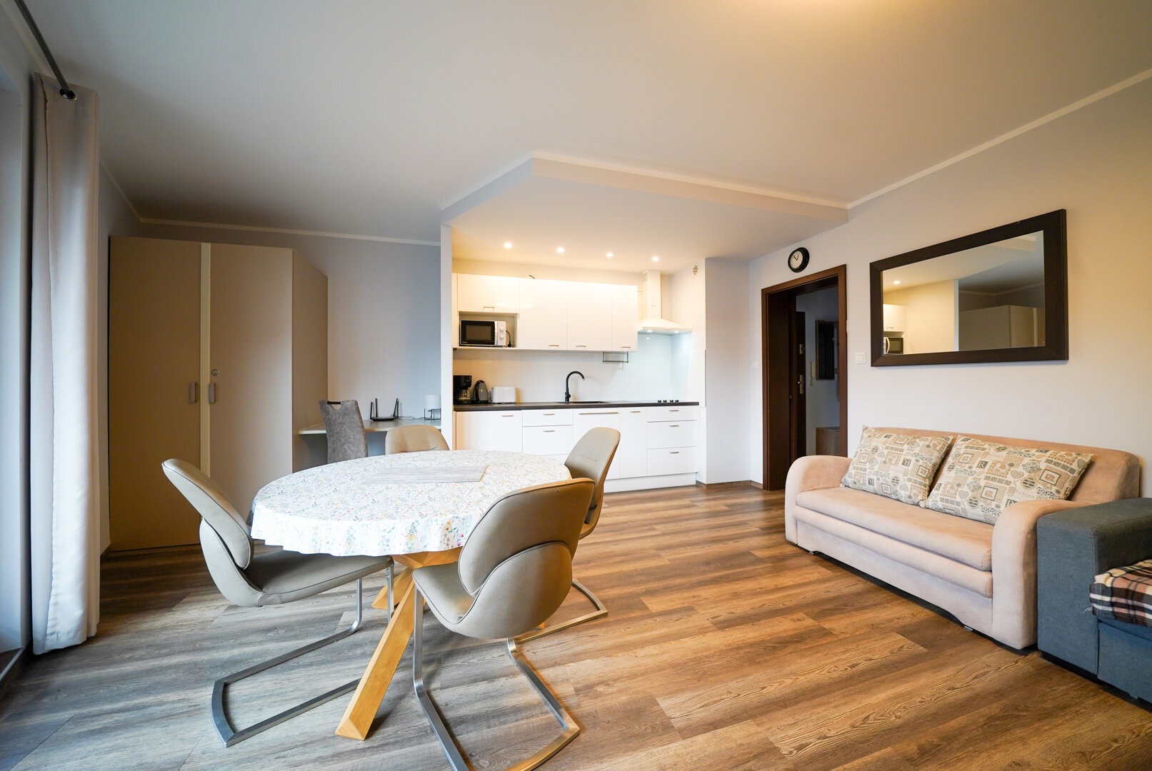 Apartament został zaprojektowany z myślą o komfortowym pobycie maksymalnie 5 osób. Centralną część stanowi przestronny salon, w którym znajduje się rozkładana kanapa dla 2 osób oraz dodatkowa kanapa dla 1 osoby, zapewniające wygodne miejsca do wypoczynku.Naprzeciwko kanap zamontowany jest duży telewizor naścienny, umożliwiający komfortowe oglądanie programów i filmów.Dodatkowo w salonie znajduję się pojemna szafa oraz biurko.