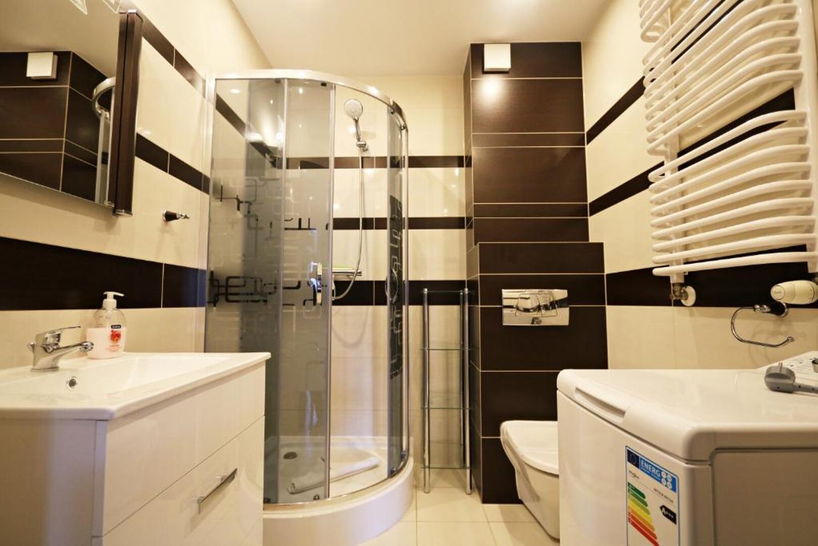 Łazienka w apartamencie została zaprojektowana z myślą o wygodzie i funkcjonalności. Wyposażona jest w pralkę wrzutową, co znacząco ułatwia pobyt, zwłaszcza podczas dłuższych wizyt. Dodatkowo znajduje się w niej kabina prysznicowa, zapewniająca komfort codziennej higieny.