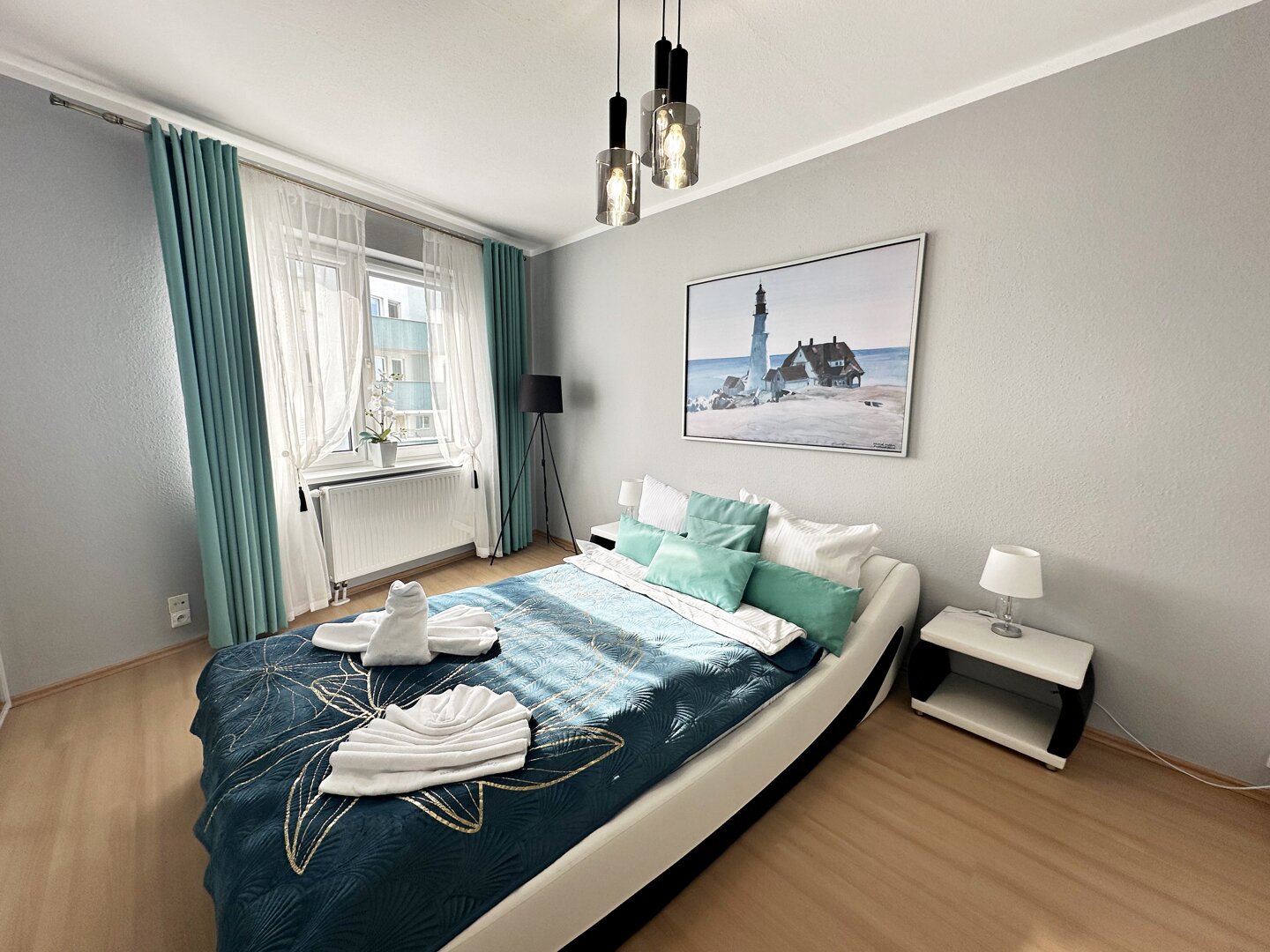 Apartament 2 pokojowy przeznaczony jest dla maksymalnie 4 osób i znajduję się na 5 piętrze od strony zachodniej budynku, wraz z widokiem na morze
