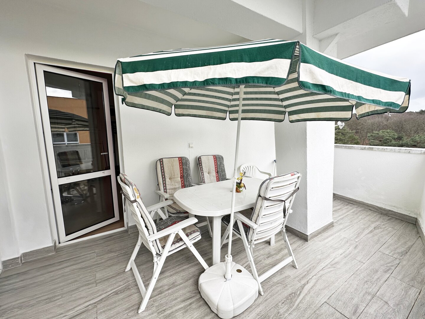 * balkonu z zachodnim widokiem na morze, wraz z meblami tarasowymi