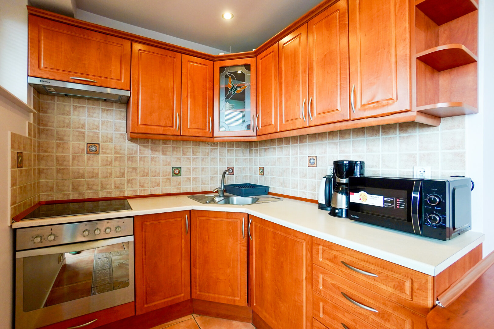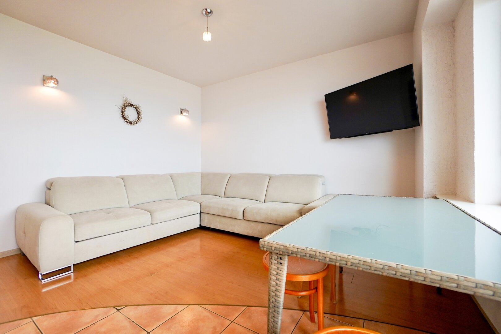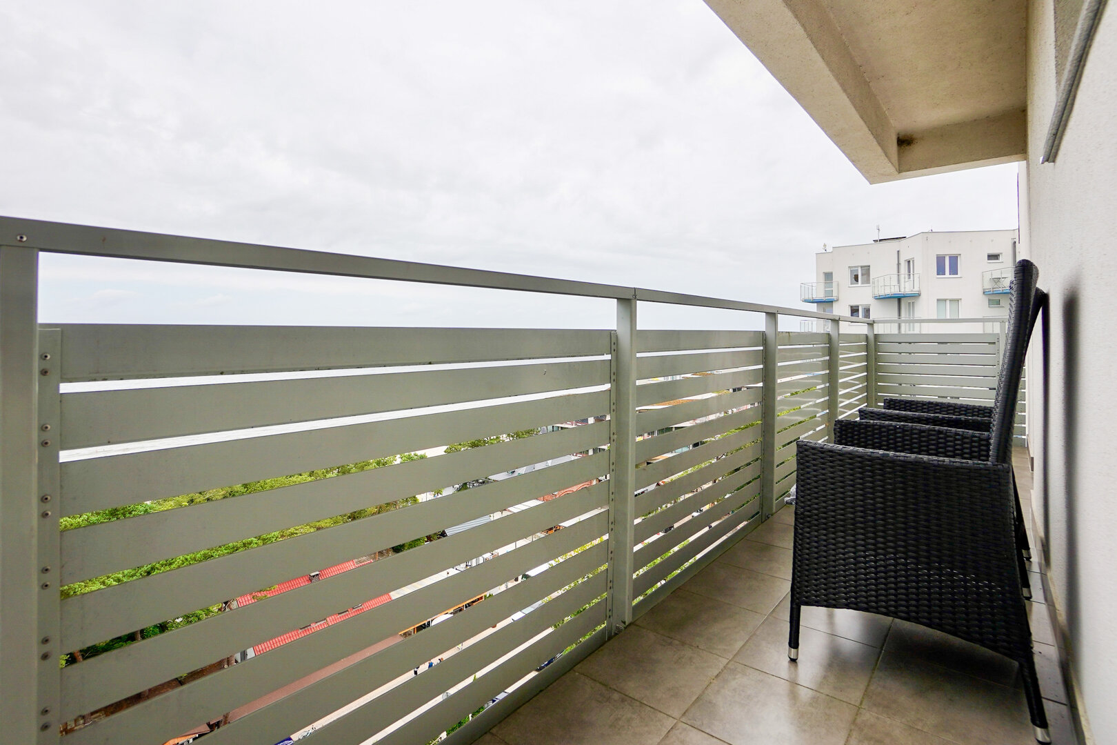 Apartament przeznaczony jest dla maksymalnie 5 osób. W skład apartamentu wchodzi salon z rozkładaną sofą do wypoczynku,oraz spania dla dwóch osób,wraz z częścią jadalnianą,połączoną z aneksem kuchennym. Apartament posiada przestronną sypialnie z łóżkiem małżeńskim,oraz rozkładaną sofę przeznaczoną dla jednej osoby.Aneks kuchenny jest w pełni wyposażony w przybory kuchenne, jest tam: lodówka, kuchenka mikrofalowa, płyta indukcyjna,piekarnik, ekspres do kawy, zestawy garnków, patelni i sztućców.Łazienka wyposażona jest w wannę z prysznicem oraz pralkę.Lokal usytuowany jest na 6 piętrze. Goście mają możliwość podziwiania z balkonu widoku na morze.