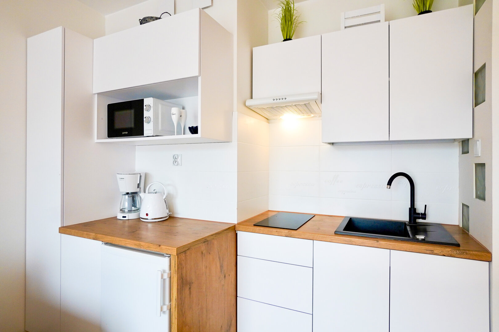 Salon połączony z kompaktowym aneksem kuchennym, który pomieści w sobie niezbędne przybory oraz sprzęt do gotowania to idealne rozwiązanie przy dłuższych pobytach dla par jak i rodziny z dziećmi