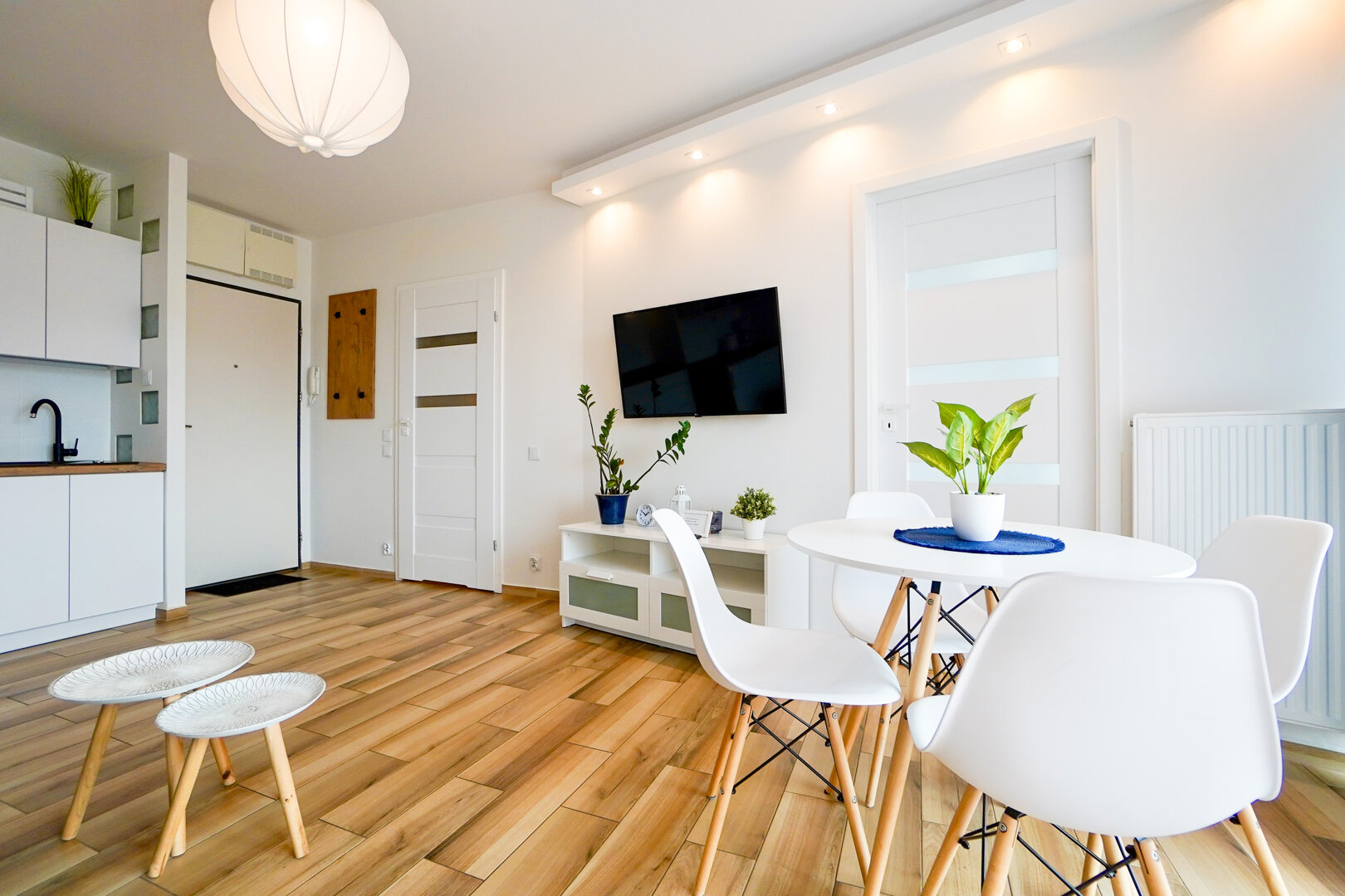 Salon pełni funkcję wspólnej przestrzeni dziennej. Znajduje się w nim rozkładana kanapa, która wieczorem może służyć jako dodatkowe miejsce do spania dla dwóch osób.Salon jest jasny i gustownie urządzony, z nastrojowym oświetleniem i miejscem do relaksu przed telewizorem.Bezpośrednie wyjście z salonu na balkon dodaje do apartamentu dużo dziennego światła przez co lokal jest ciepły i tworzy przytulną atmosferę.
