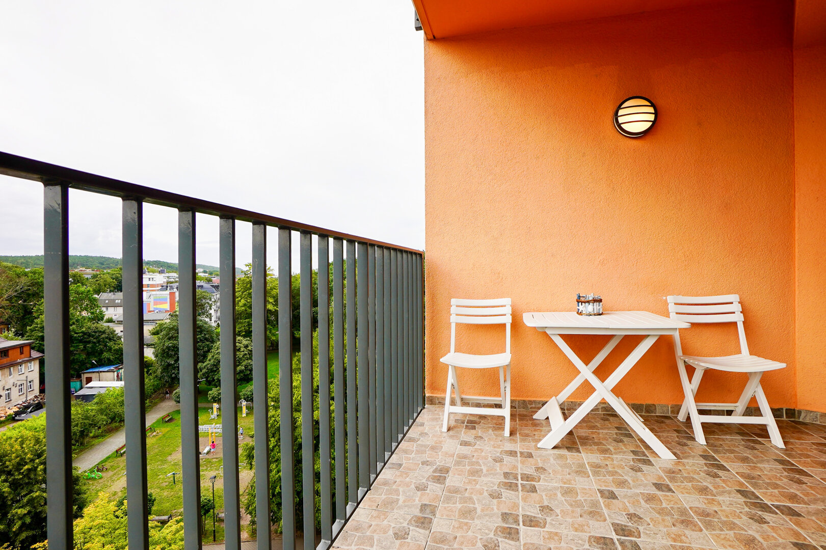 Balkon wyposażony jest w meble tarasowe oraz stolik, stanowi przedłużoną część mieszkalną i oferuje miejsce do relaksu na świeżym powietrzu.