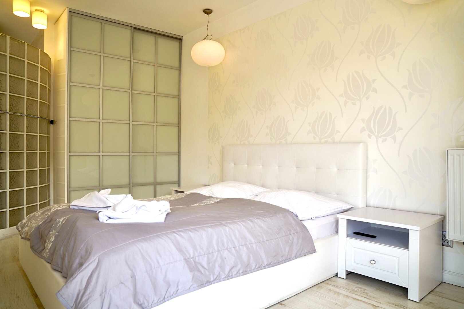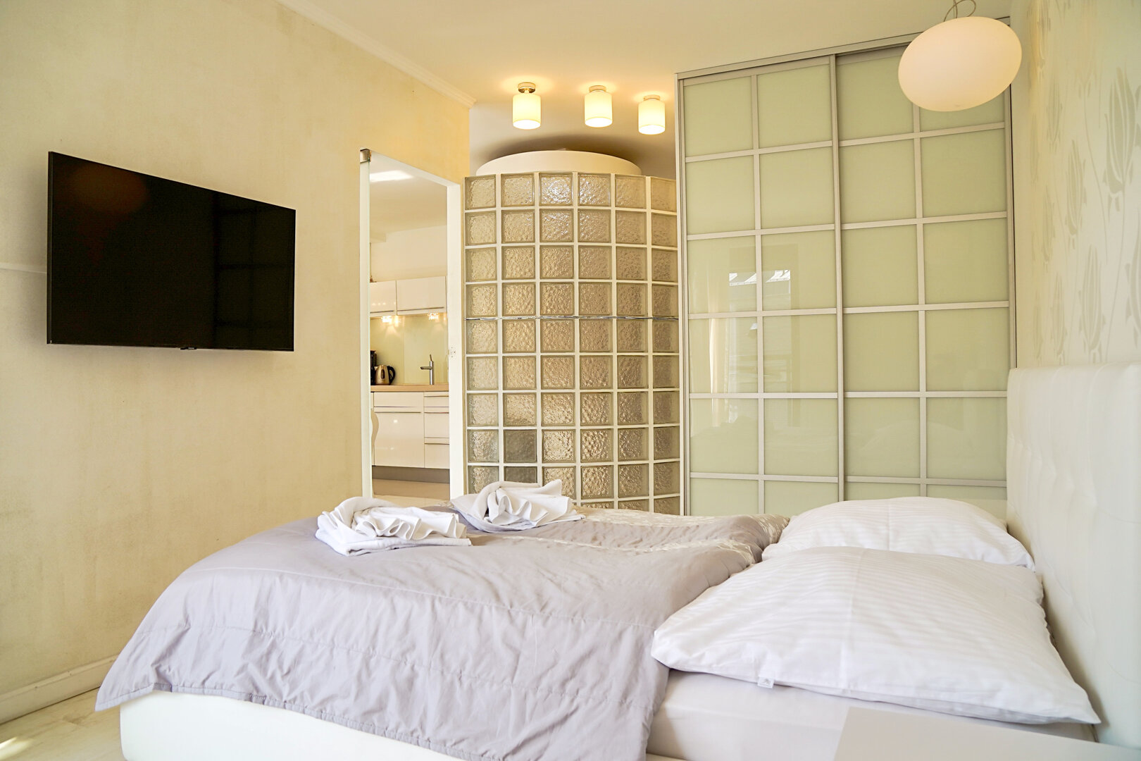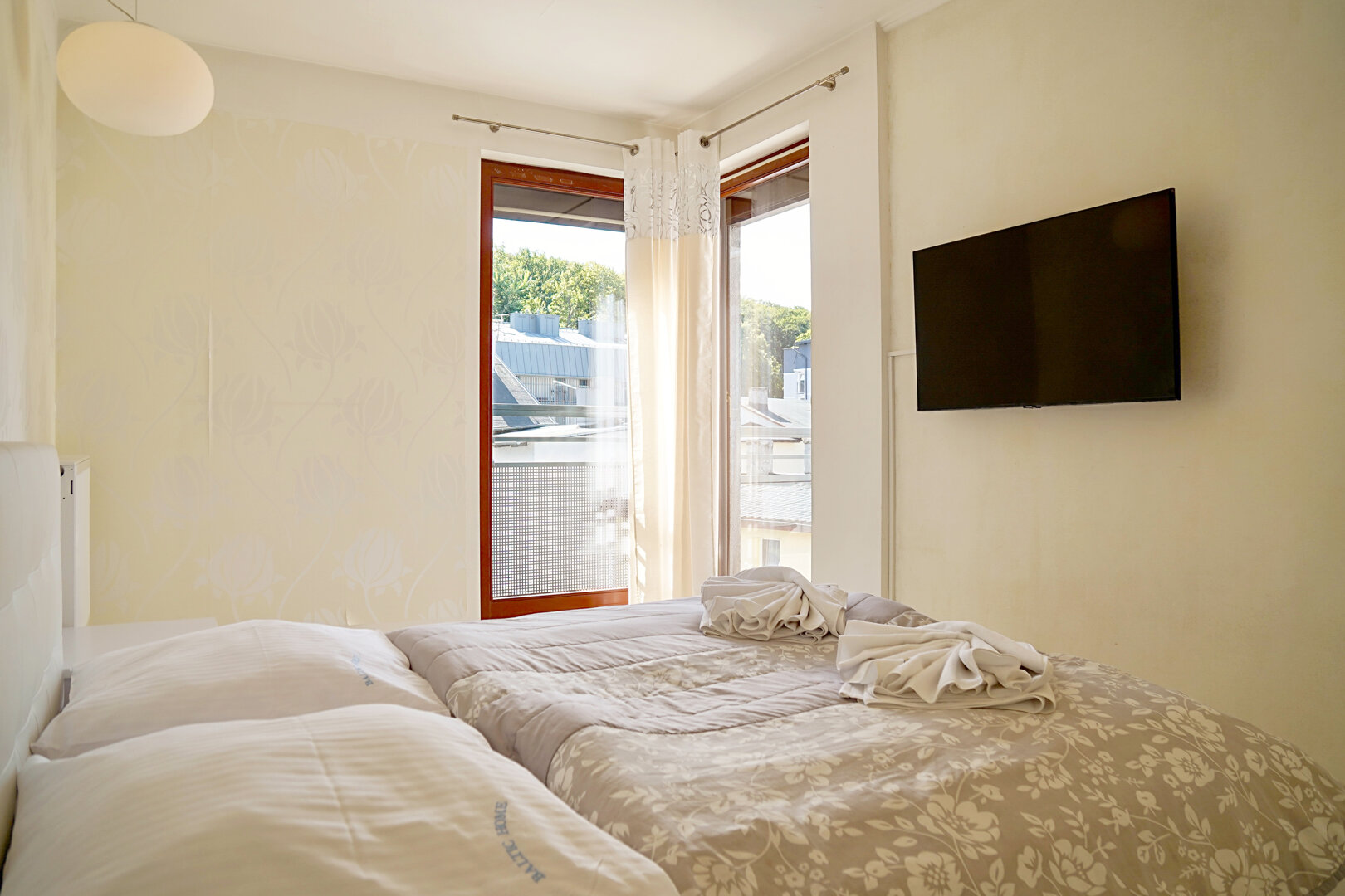 Sypialnia utrzymana jest w jasnej, spokojnej kolorystyce, sprzyjającej wypoczynkowi. Duże okna zapewniają doskonałe doświetlenie wnętrza oraz bezpośrednie wyjście na balkon, który stanowi idealne miejsce na poranną kawę lub chwilę relaksu na świeżym powietrzu. Lekkie, półprzezroczyste zasłony delikatnie filtrują światło, tworząc przytulną atmosferę. Komfortowe, dwuosobowe łóżko oraz telewizor zamontowany na ścianie dopełniają funkcjonalny i elegancki charakter pomieszczenia.