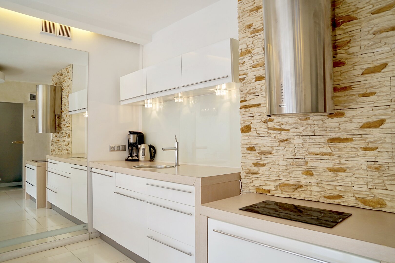 Aneks kuchenny jest wyposażony w białe, lakierowane fronty o gładkiej powierzchni, podkreślające nowoczesny charakter wnętrza. Szklany panel nad blatem odbija światło, wzmacniając efekt przestronności. Całość uzupełniają subtelne, punktowe oświetlenie oraz elegancki, stalowy okap.