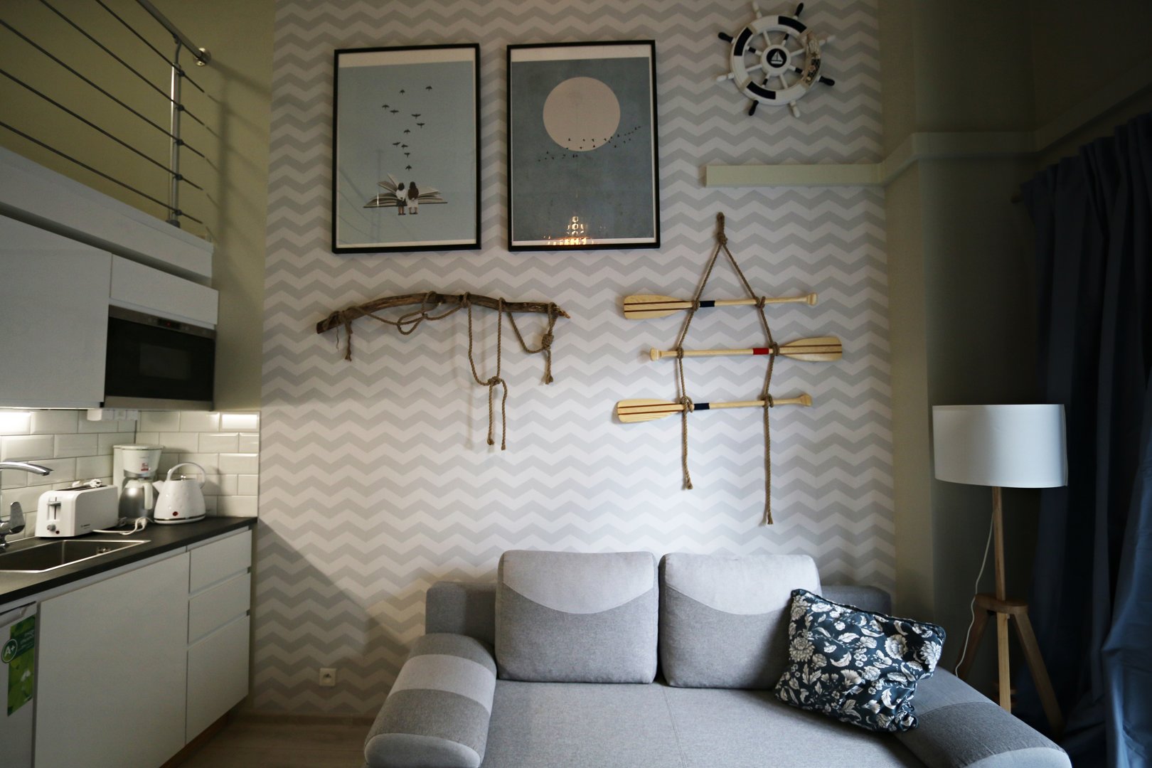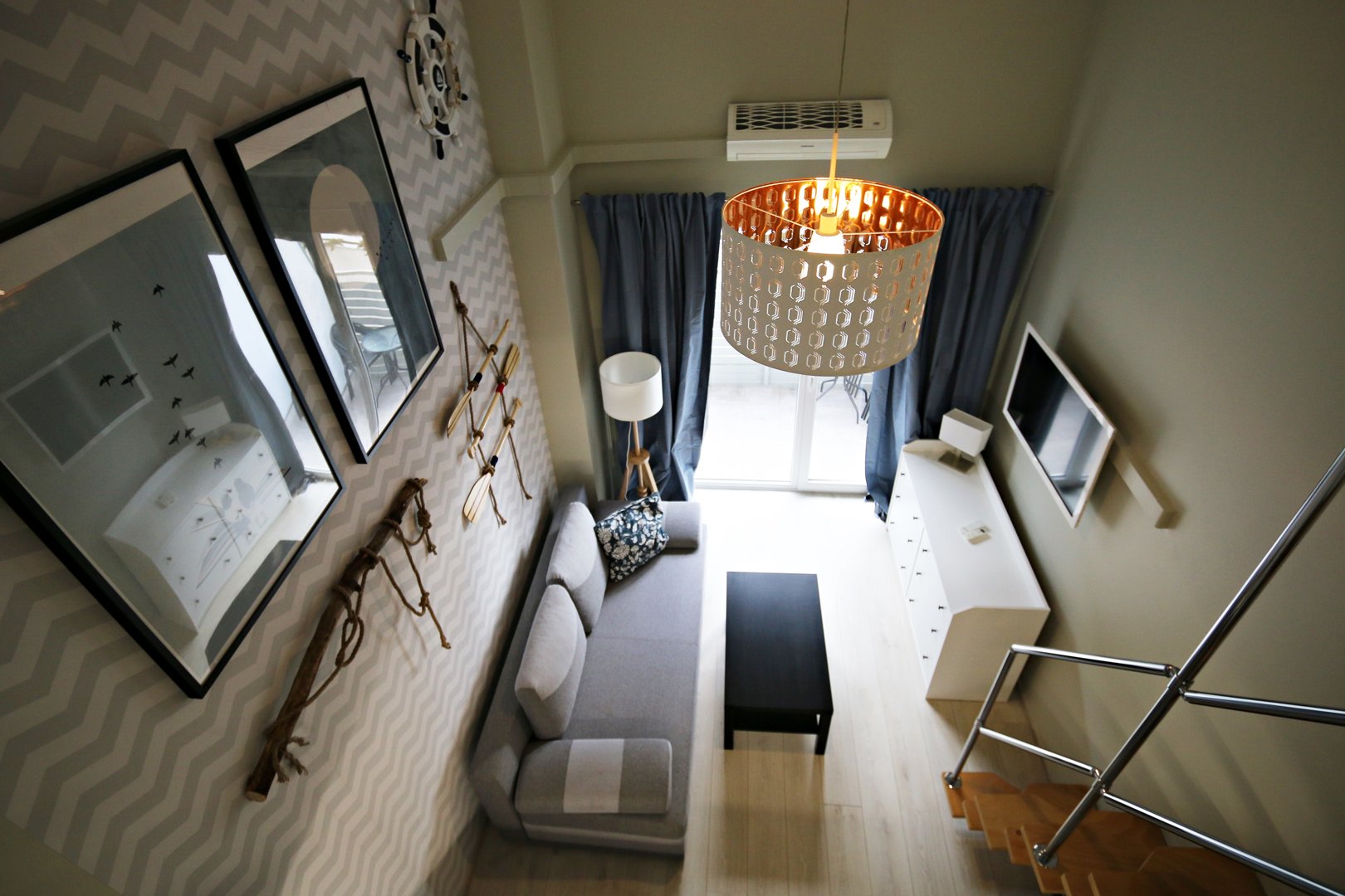 Przytulny apartament mieści w sobie antresolę z łóżkiem małżeńskim, salon z rozkładaną, jednoosobową sofą połączoną z aneksem kuchennym. Aneks kuchenny jest w pełni wyposażony w przybory kuchenne i sprzęt do przygotowywania posiłków.Łazienka mieści kabinę prysznicową a cały apartament urządzony jest w nadmorskim stylu.