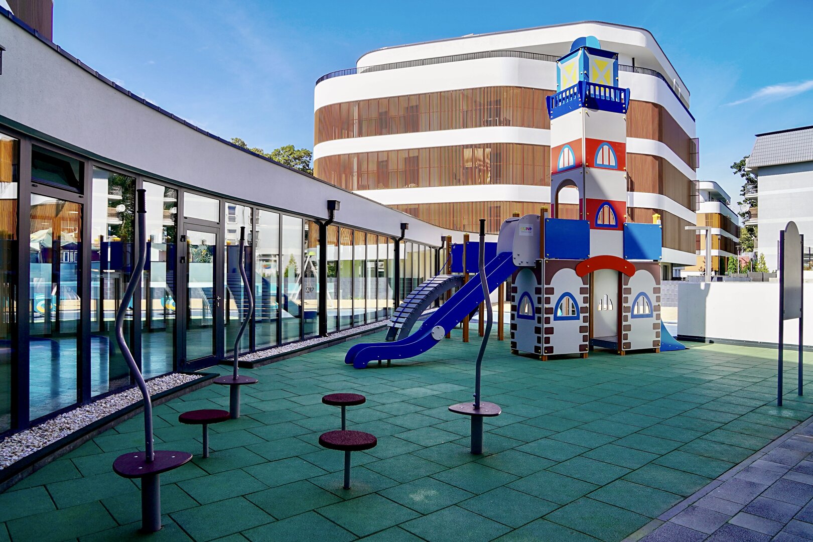 Ponadto do dyspozycji naszych gości jest: basen zewnętrzny, basen wewnętrzny, sauna, sala zabaw dla dzieci,plac zabaw dla dzieci oraz sala fitness na terenie obiektu