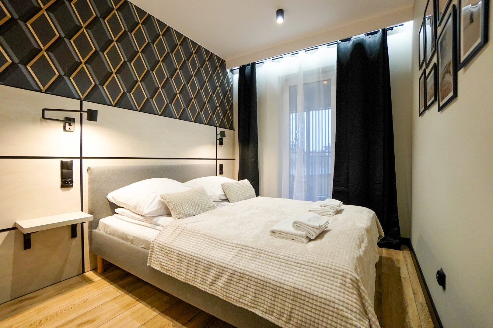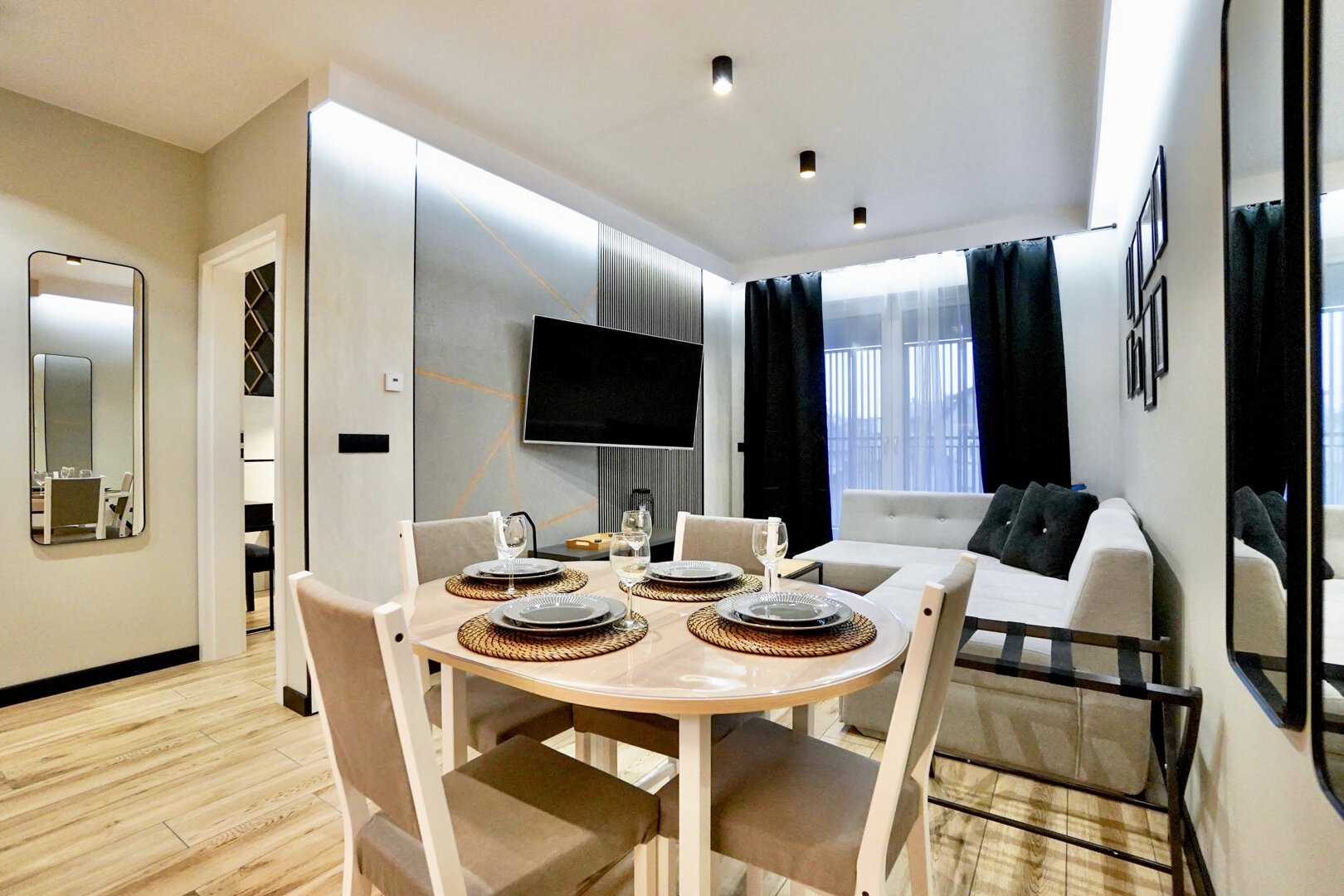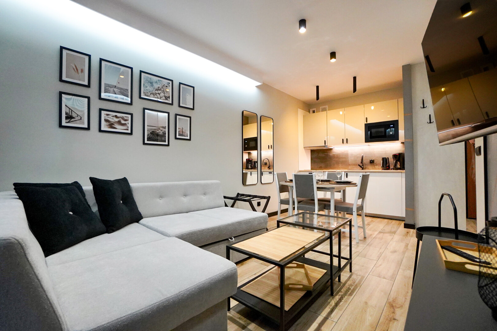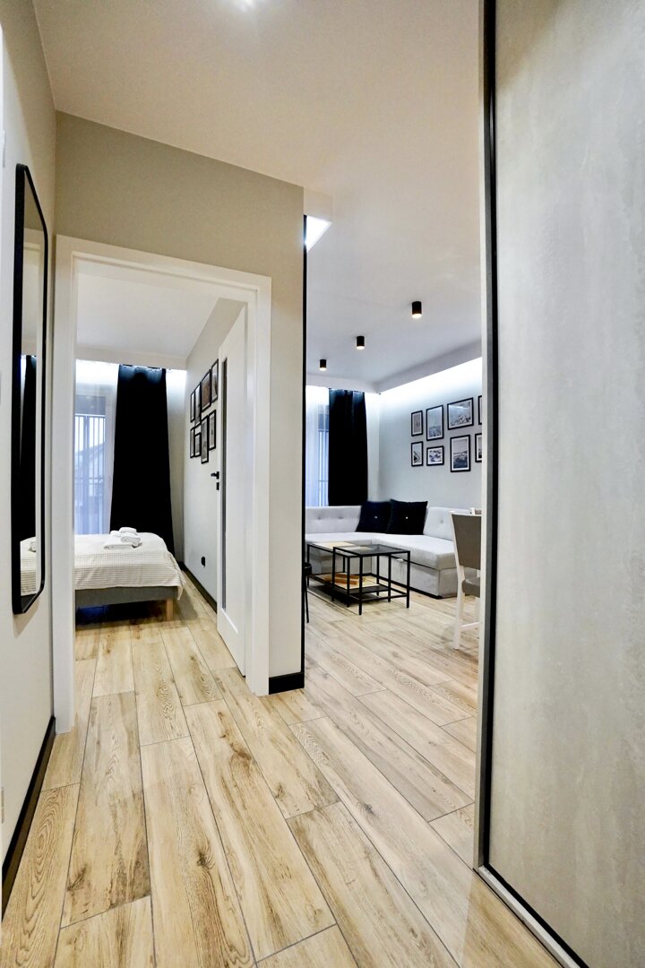 Apartament dla maksymalnie 4 osób to przestronne i komfortowe wnętrze, które łączy w sobie nowoczesny design i funkcjonalność. W salonie znajduje się rozkładana kanapa dla dwóch osób, pełniąca rolę zarówno miejsca do wypoczynku w ciągu dnia, jak i wygodnego łóżka na noc. Przestrzeń uzupełnia duży telewizor umieszczony na ścianie, doskonały do wspólnego oglądania ulubionych filmów i programów.Wyjątkowy klimat wnętrza podkreślają podświetlenia LED, które znajdują się zarówno przy telewizorze, jak i przy wyjściu na balkon. Te subtelne akcenty świetlne nadają wnętrzu przytulnego i nowoczesnego charakteru, szczególnie wieczorami.