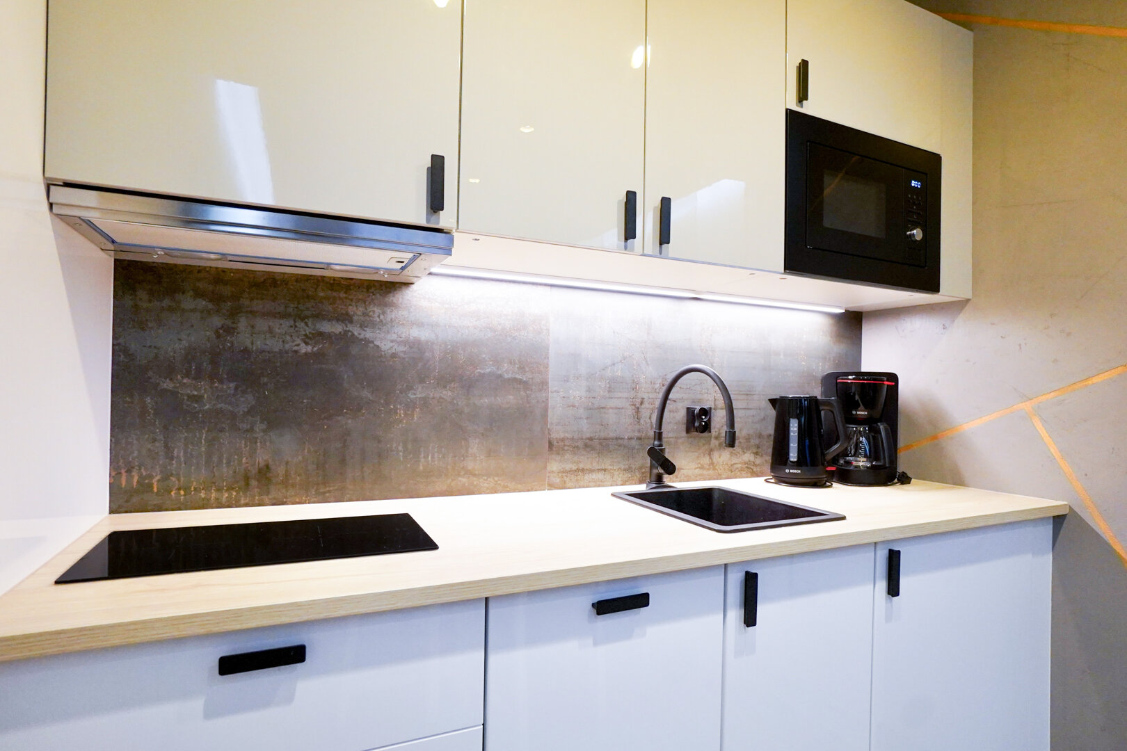 Aneks kuchenny w apartamencie został zaprojektowany z myślą o wygodzie codziennego użytkowania. Jest w pełni wyposażony w podstawowy sprzęt do gotowania, w tym płytę grzewczą, mikrofalówkę, czajnik oraz zestaw naczyń i przyborów kuchennych, co pozwala na przygotowanie domowych posiłków w komfortowych warunkach. Jasne fronty szafek w połączeniu z eleganckim blatem nadają przestrzeni nowoczesny i schludny charakter.Tuż obok aneksu znajduje się stolik z krzesłami dla 4 osób. To idealne miejsce na wspólne posiłki.