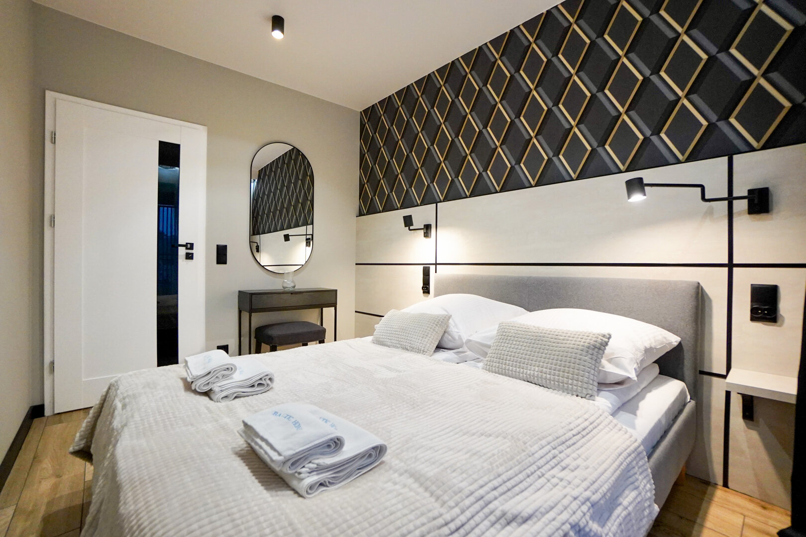 Wnętrze wzbogaca stylowa toaletka z dużym lustrem, idealna do porannej pielęgnacji czy przygotowań na wieczór. Dodatkowe oświetlenie zamontowane przy łóżku nie tylko podkreśla przytulną atmosferę, ale także pełni funkcję praktyczną, umożliwiając czytanie lub delikatne oświetlenie przestrzeni bez konieczności włączania głównego światła. Całość tworzy harmonijne, komfortowe miejsce idealne do odpoczynku.