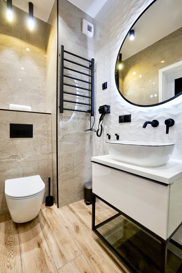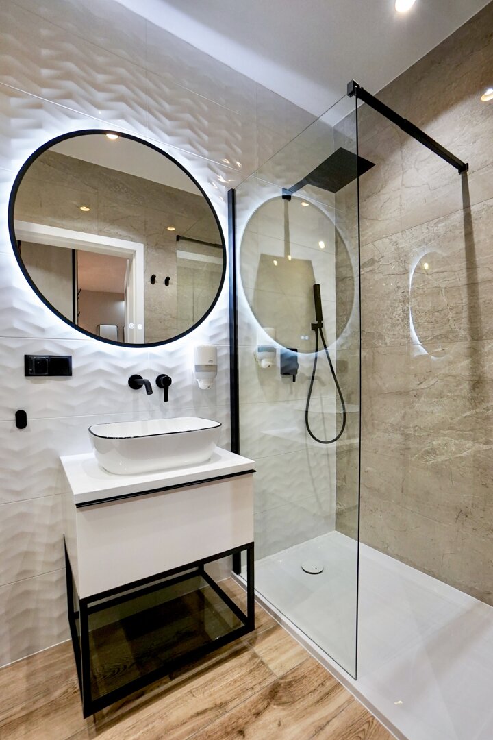 Łazienka w apartamencie zaprojektowana z dbałością o każdy detal. Centralnym punktem jest stylowa kabina prysznicowa o minimalistycznym designie, zapewniająca komfort podczas użytkowania.Na ścianie znajduje się duże, okrągłe lustro, które nadaje wnętrzu elegancji i optycznie je powiększa. Lustro zostało wyposażone w dodatkowe oświetlenie typu LED, co nie tylko podkreśla jego nowoczesny charakter, ale także zapewnia funkcjonalność, szczególnie podczas porannej toalety