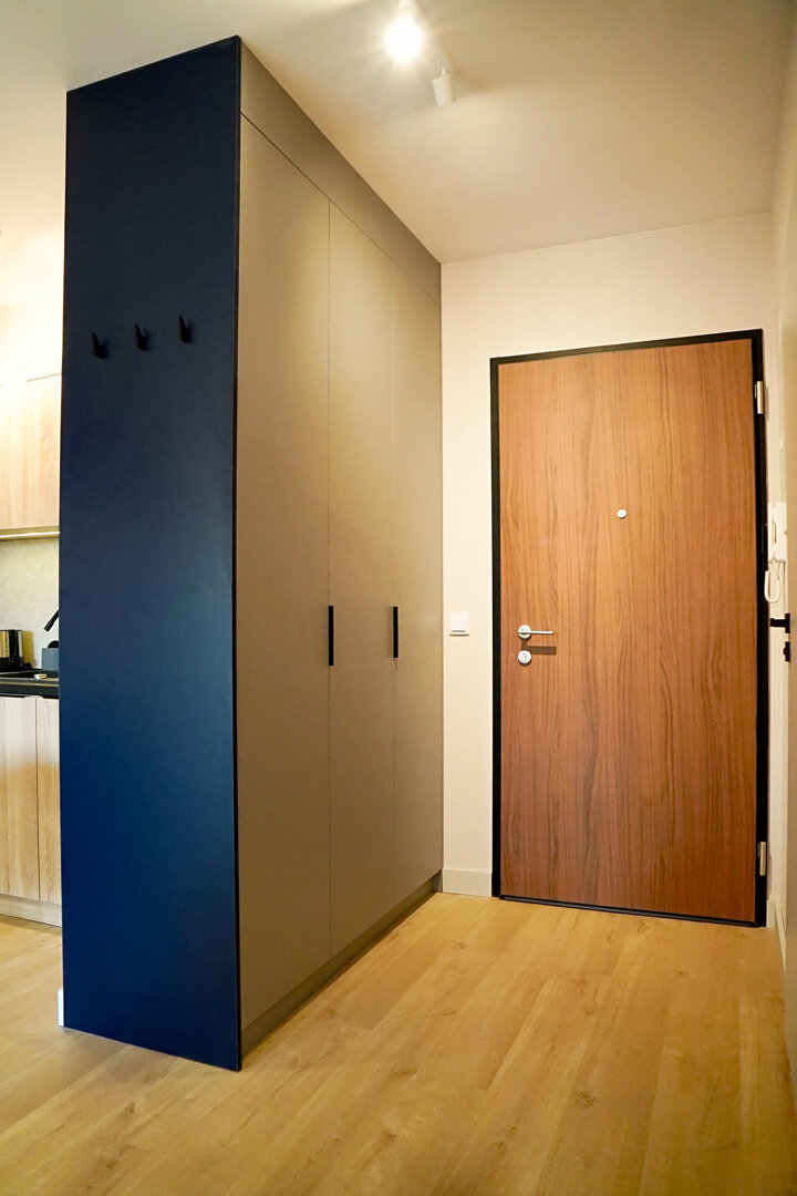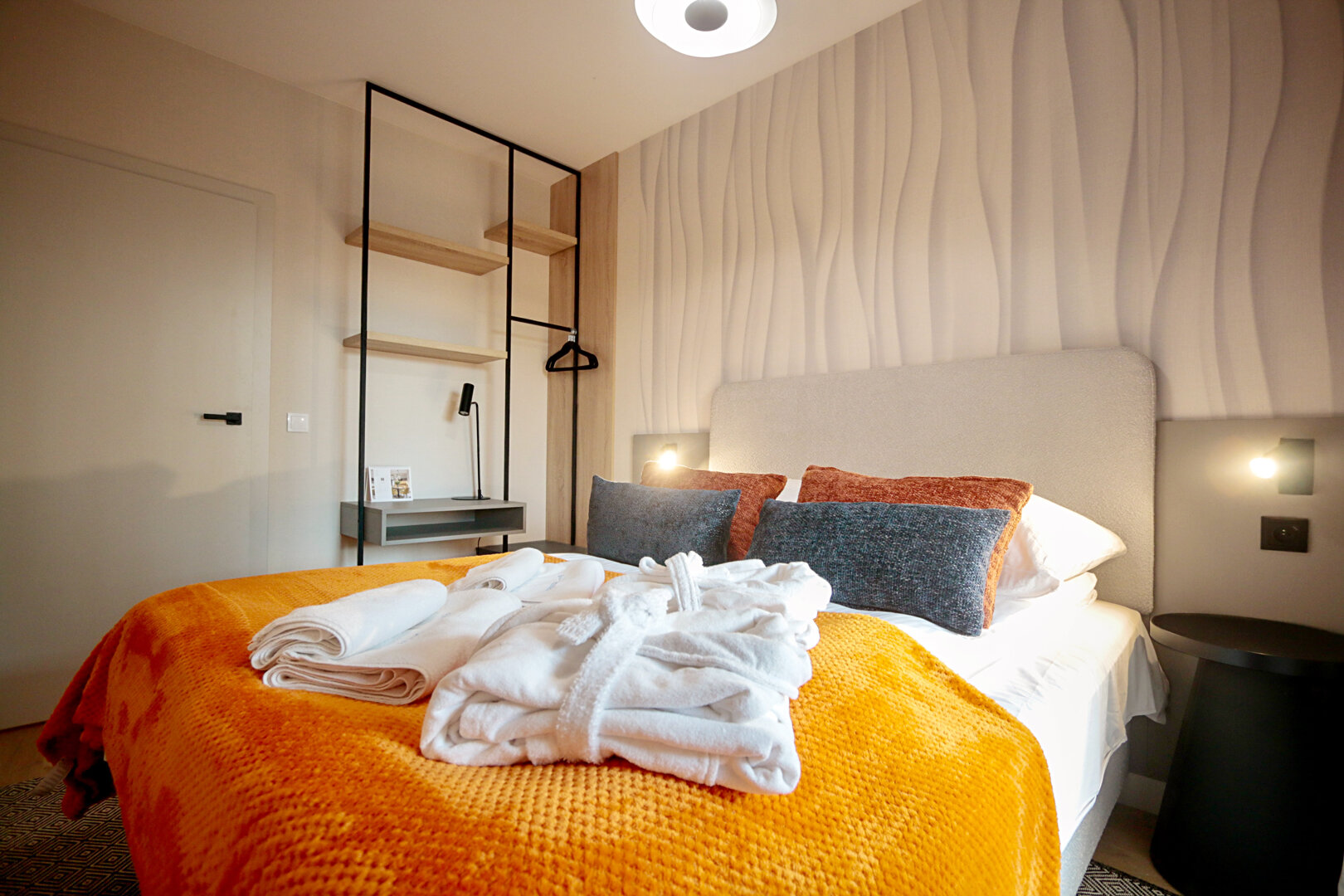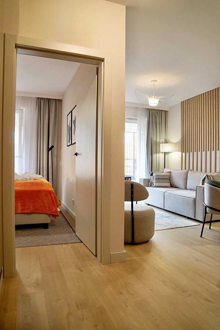 Przytulna sypialnia wyposażona jest w wygodne łóżko małżeńskie, które zapewnia komfortowy sen.Sypialnia w apartamencie oferuje wyjątkowy komfort dzięki bezpośredniemu wyjściu na balkon, co dodaje przestrzeni oraz pozwala cieszyć się świeżym powietrzem o każdej porze dnia.