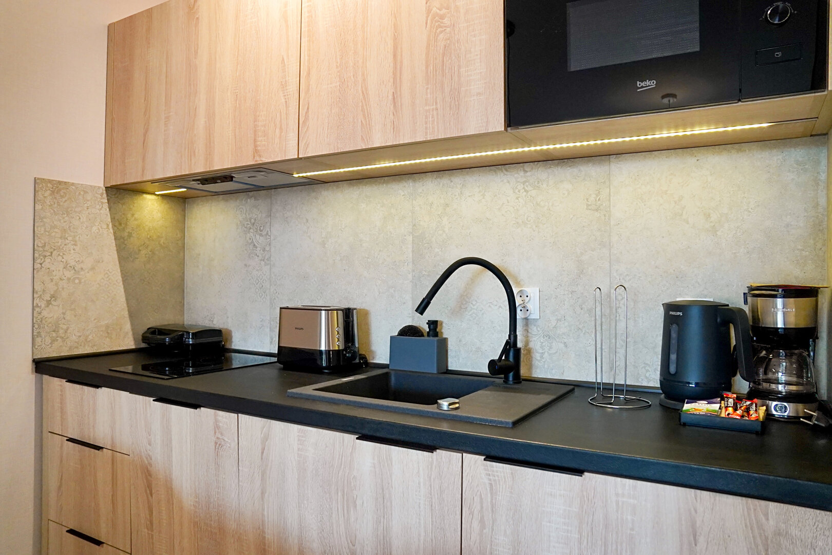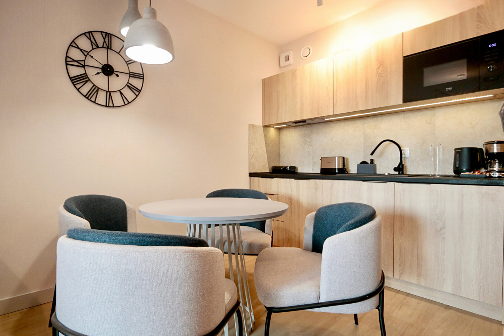 Salon połączony z funkcjonalnym w pełni wyposażonym aneksem kuchennym i sprzętem do gotowania. W aneksie znajduje się również stół dla czterech osób, doskonały do wspólnych posiłków.