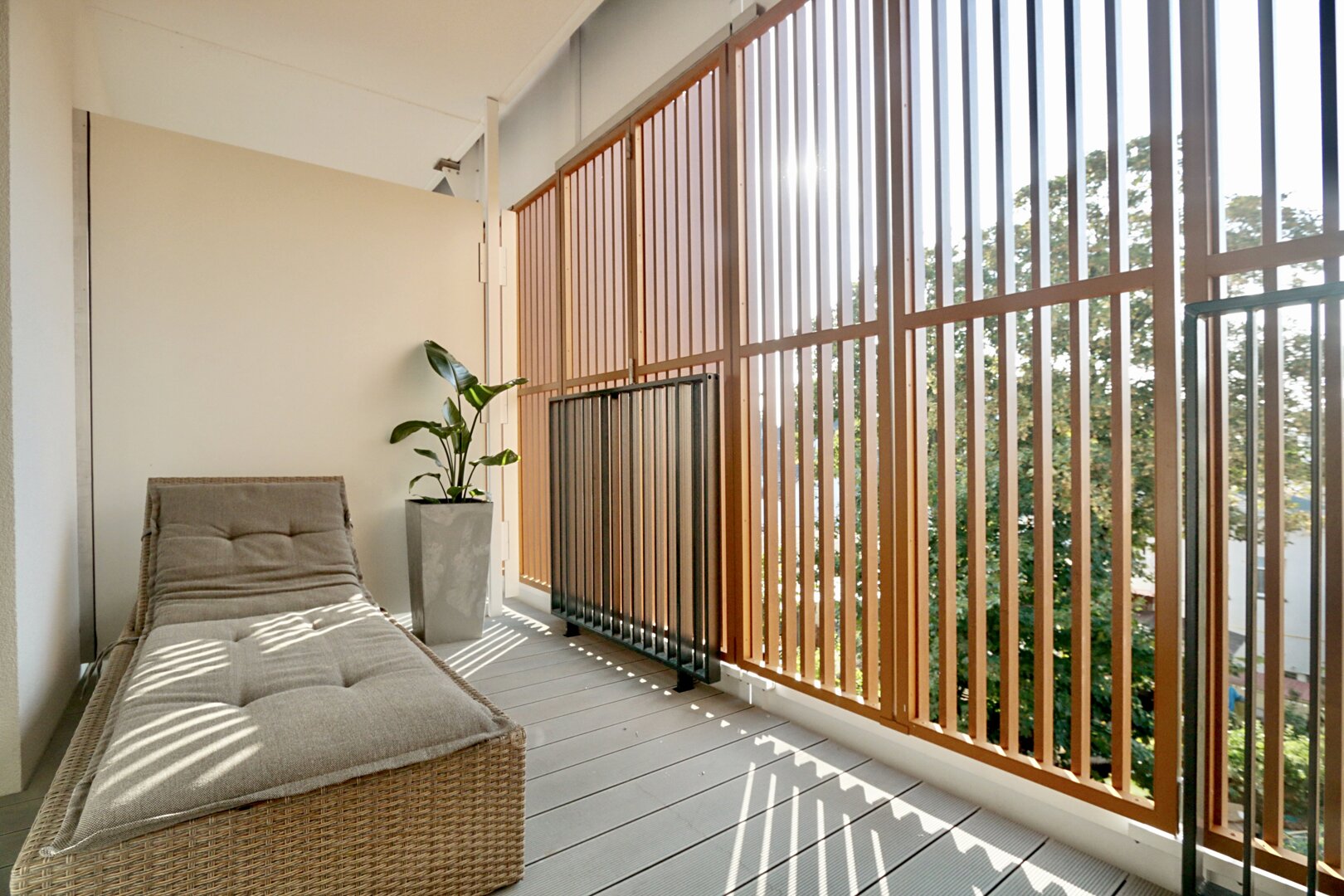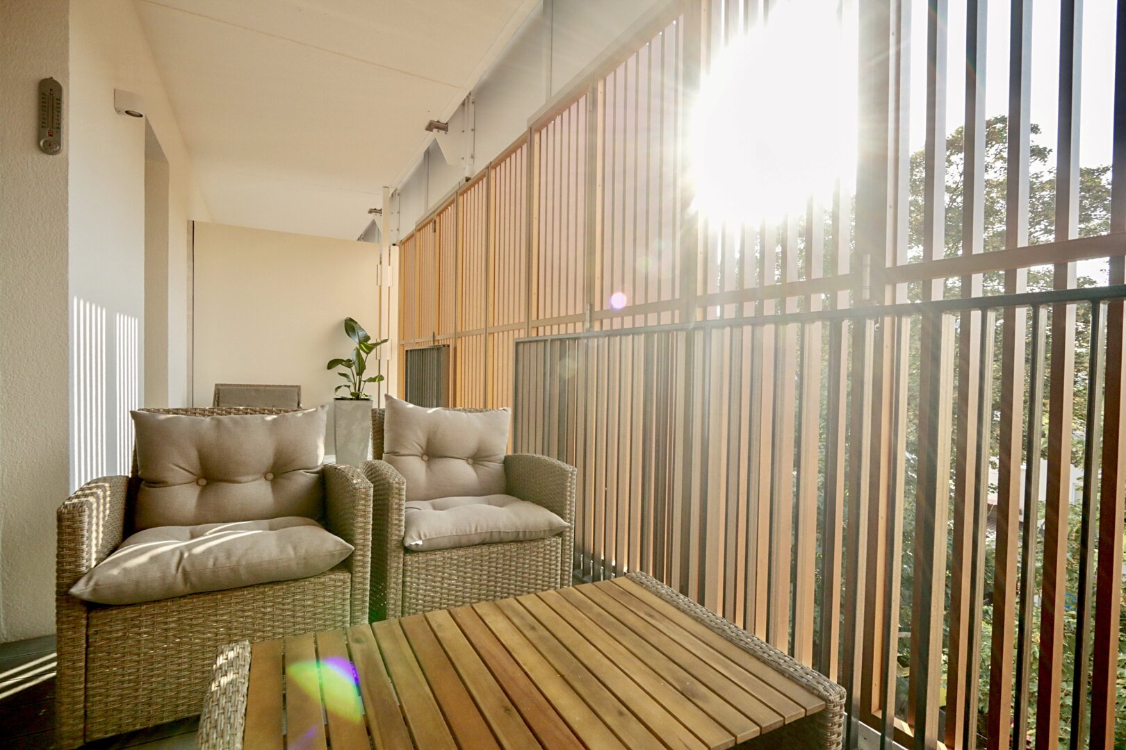 Balkon jest wyposażony w wygodne meble tarasowe, takie jak stolik, leżak ogrodowy, krzesła, zapewniając miejsce do odpoczynku, spożywania posiłków czy porannej kawy na świeżym powietrzu.