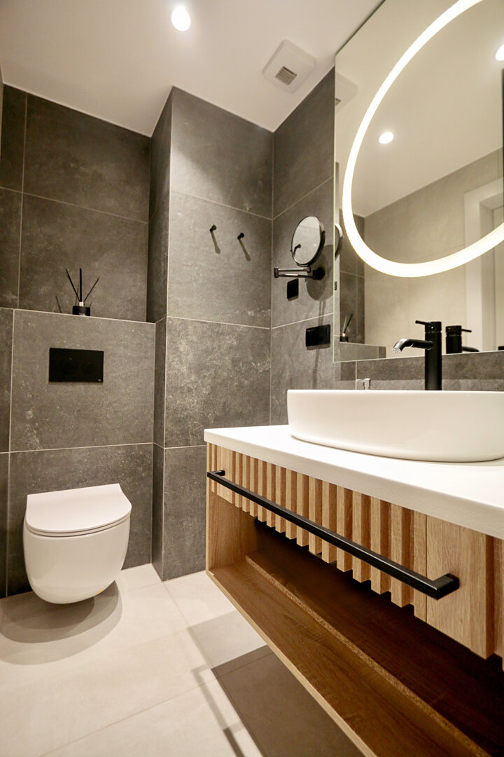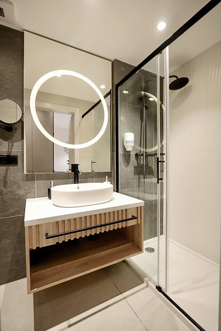 Łazienka w apartamencie została zaprojektowana z myślą o funkcjonalności oraz nowoczesnym stylu, oferując wygodne warunki do codziennego użytku.Przestronna kabina prysznicowa z przezroczystymi, szklanymi drzwiami. Wyposażona w nowoczesny prysznic typu deszczownica, zapewniając komfortową i relaksującą kąpiel.Stylowa umywalka z szafką, w której można przechowywać kosmetyki i akcesoria. Nad nią znajduje się duże lustro, które optycznie powiększa przestrzeń i odbija światło, rozjaśniając całe pomieszczenie.