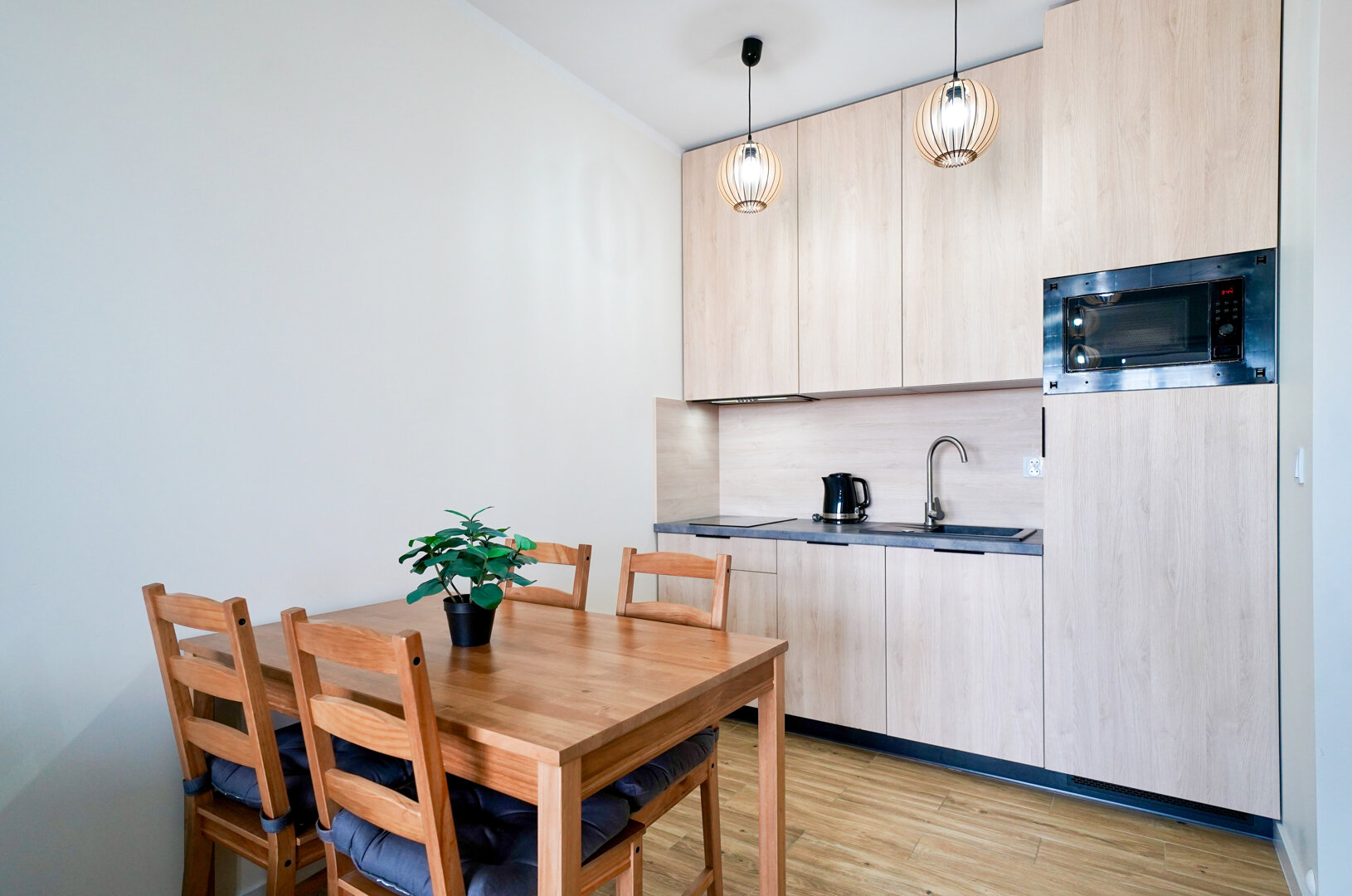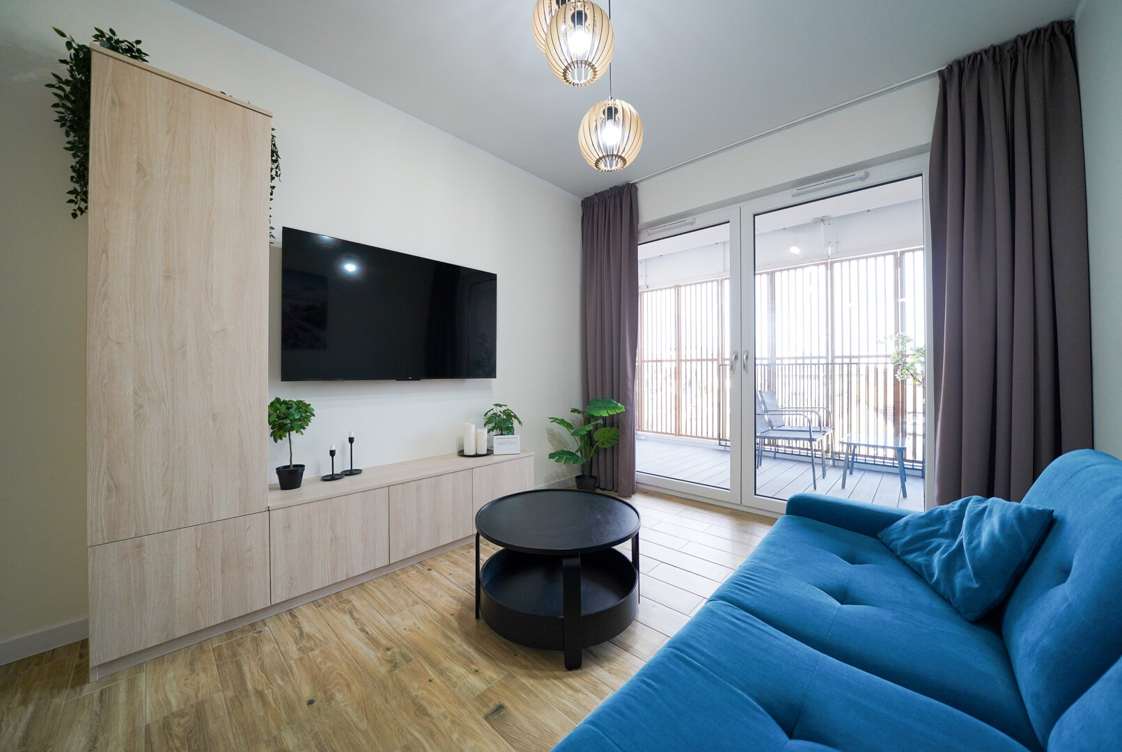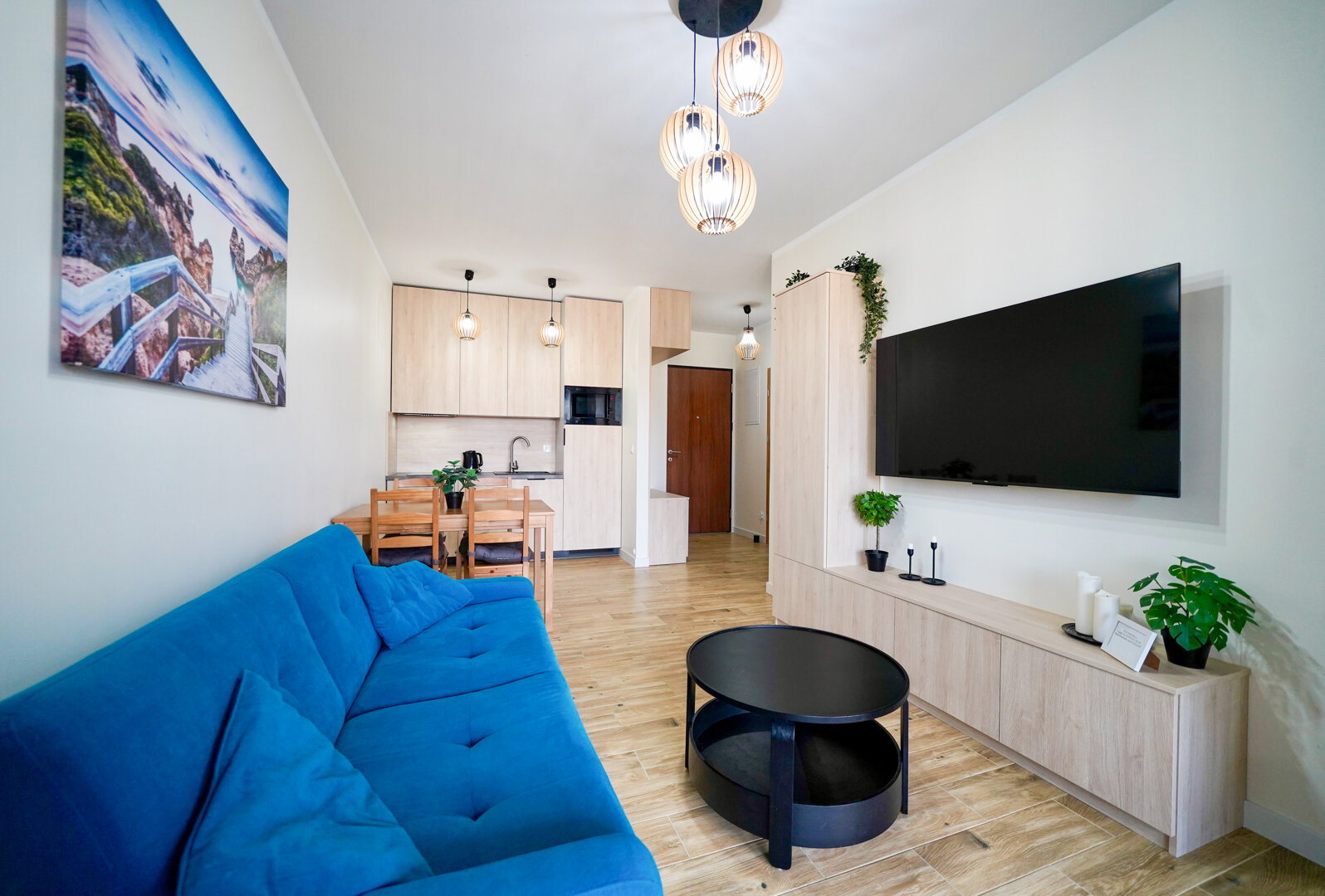 Centralnym elementem salonu jest wygodna, rozkładana sofa w intensywnym odcieniu niebieskiego, stanowiąca wyrazisty akcent kolorystyczny. Przestrzeń wypoczynkową uzupełnia okrągły stolik kawowy oraz duży telewizor zamontowany na ścianie, zapewniający komfort codziennego użytkowania.Część jadalniana z drewnianym stołem i krzesłami płynnie łączy się z nowoczesnym aneksem kuchennym, wyposażonym w jasną zabudowę oraz niezbędne sprzęty AGD.