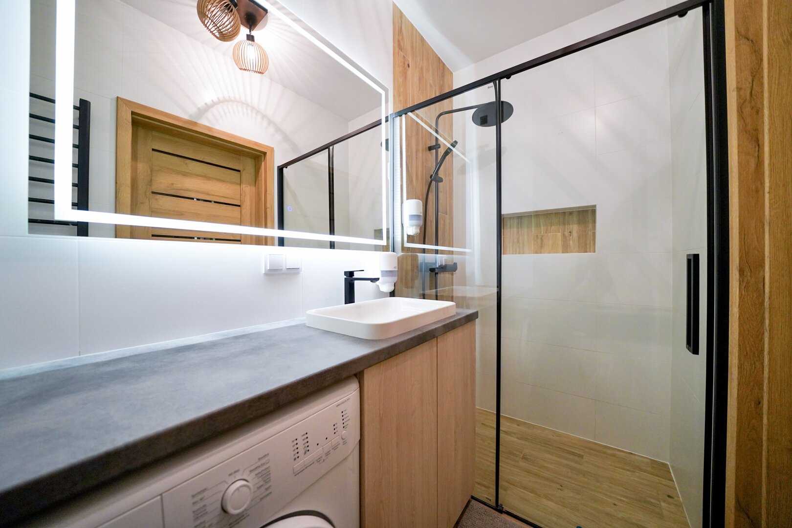 W apartamencie znajduję się łazienka urządzona w jasnej kolorystyce z elementami naturalnego drewna. Wyposażona w przestronną kabinę prysznicową typu walk-in, elegancką umywalkę nablatową, duże lustro z podświetleniem LED oraz pralkę w zabudowie. Całość tworzy estetyczną i funkcjonalną przestrzeń.