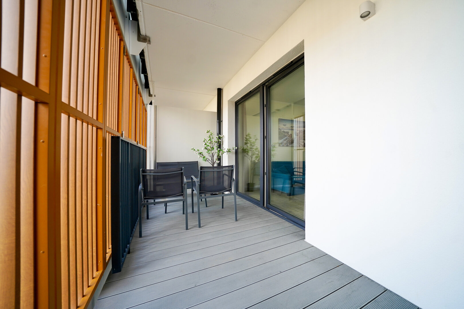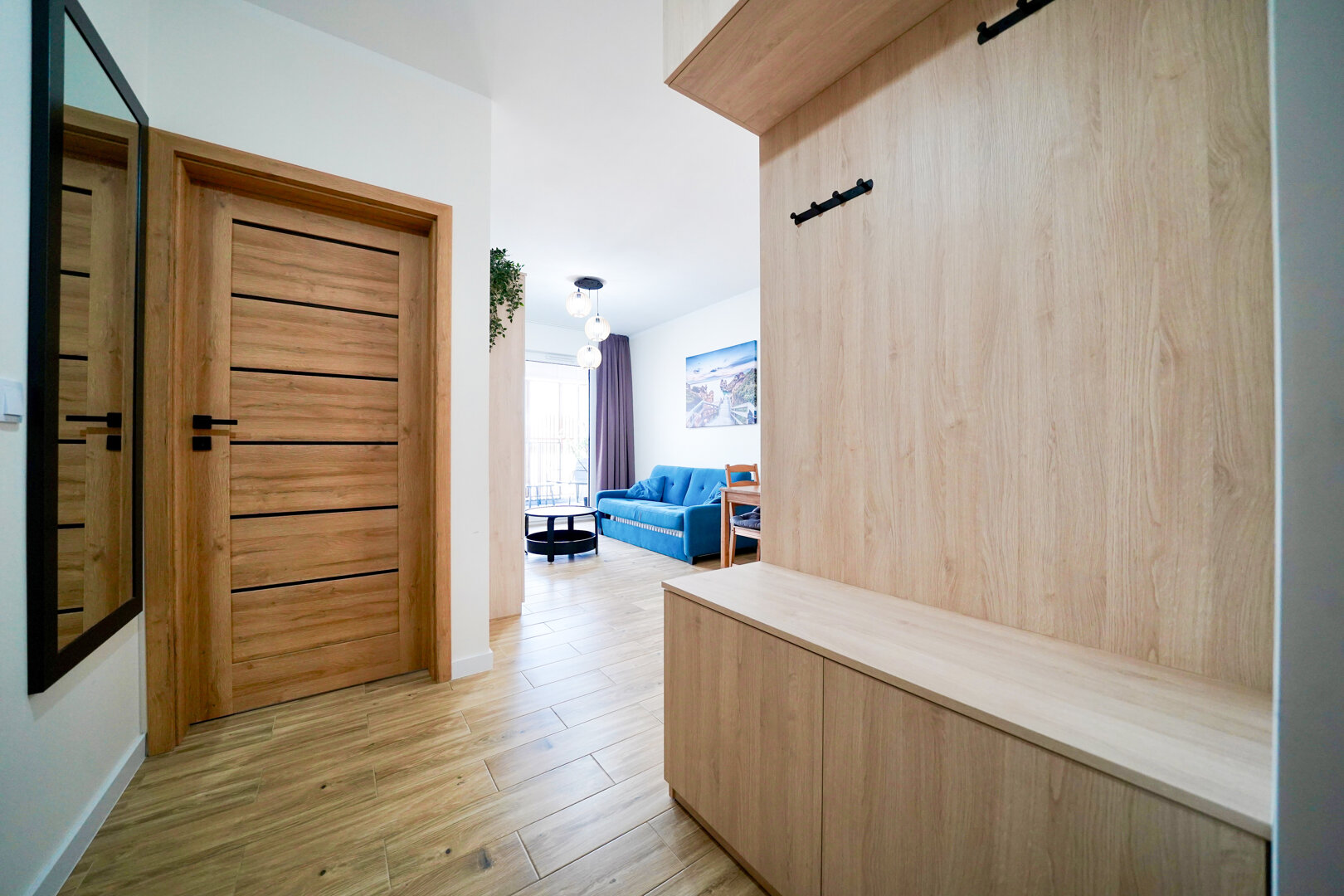Salon stanowi jasną i funkcjonalną przestrzeń dzienną, harmonijnie połączoną z aneksem kuchennym. Wnętrze utrzymane jest w nowoczesnym stylu, z dominacją naturalnych odcieni drewna i jasnych ścian, które tworzą ciepłą i przyjazną atmosferę.