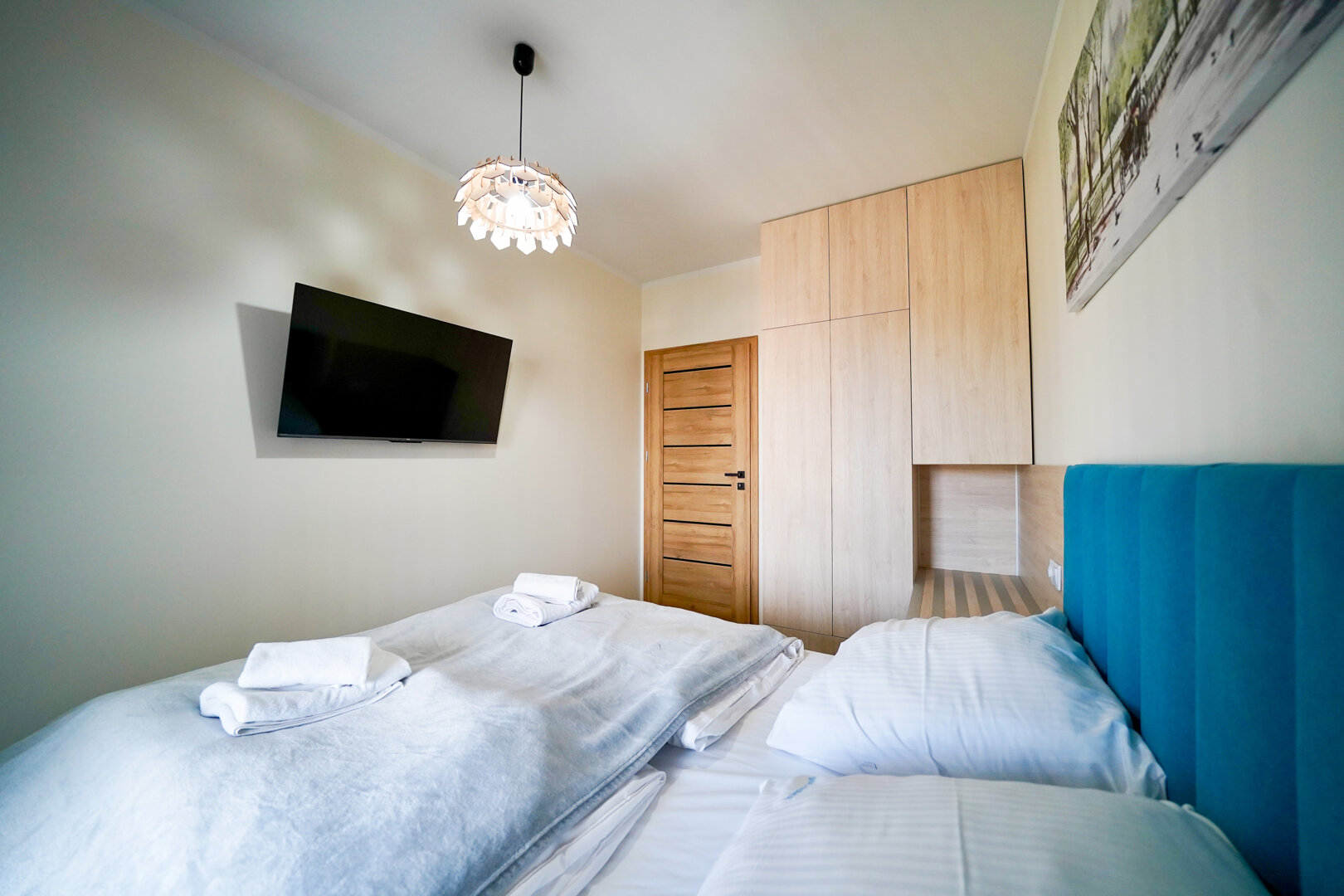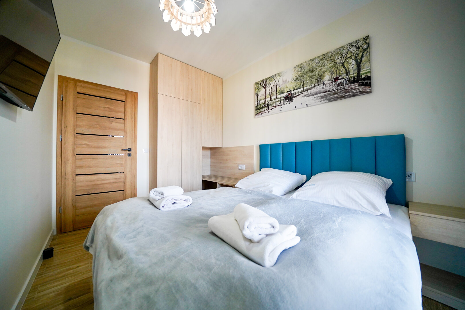 Sypialnia została urządzona w nowoczesnym i przytulnym stylu, z wykorzystaniem jasnych barw oraz naturalnych odcieni drewna. Centralnym punktem pomieszczenia jest komfortowe, dwuosobowe łóżko w eleganckim, niebieskim kolorze, który stanowi subtelny akcent dekoracyjny.