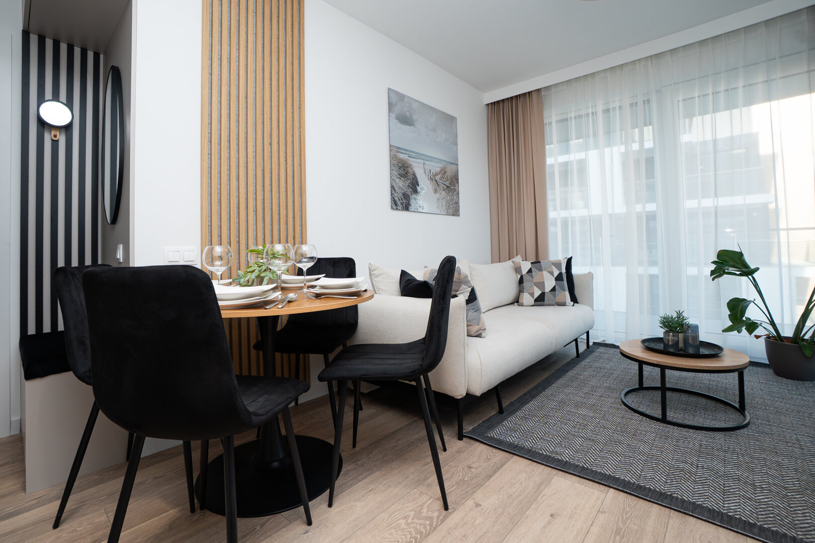 Wnętrze apartamentu obejmuje jasny salon z aneksem kuchennym, przytulną sypialnię oraz nowoczesną łazienkę. Dzięki dużym oknom wnętrze jest pełne naturalnego światła, a elegancki wystrój zapewnia komfortowy pobyt.