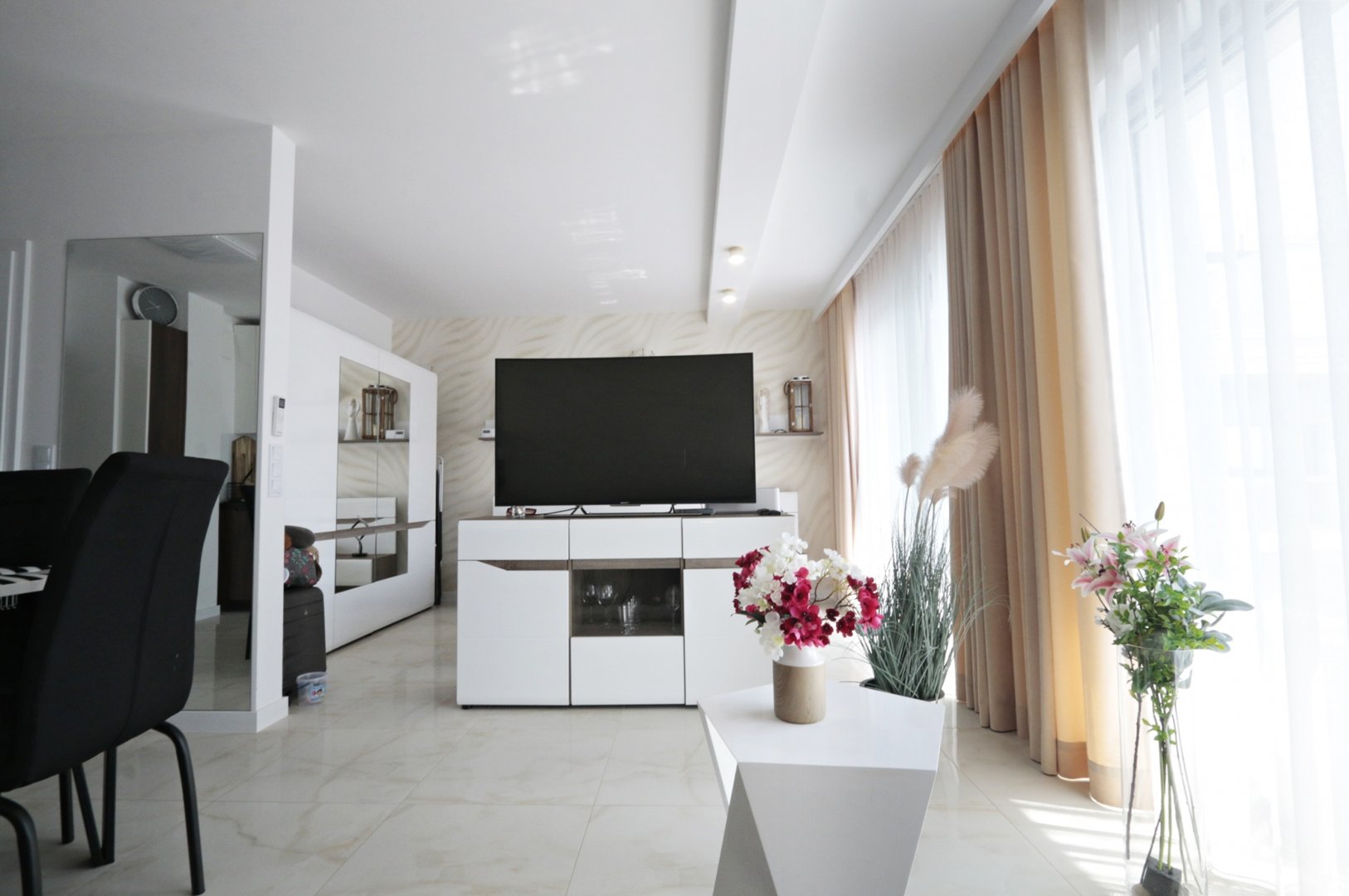 * salonu wyposażonego w łóżko małżeńskie wraz z dwuosobową, rozkładaną kanapą