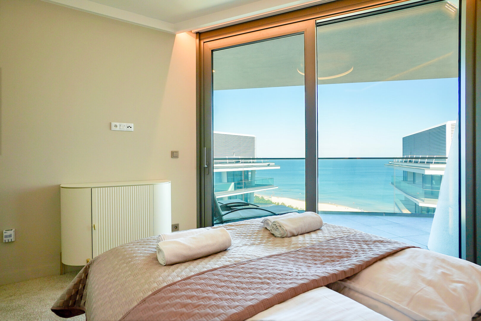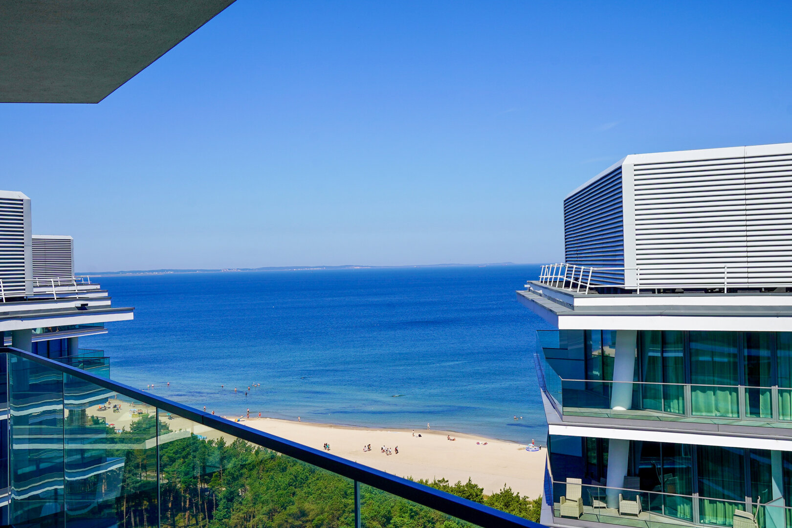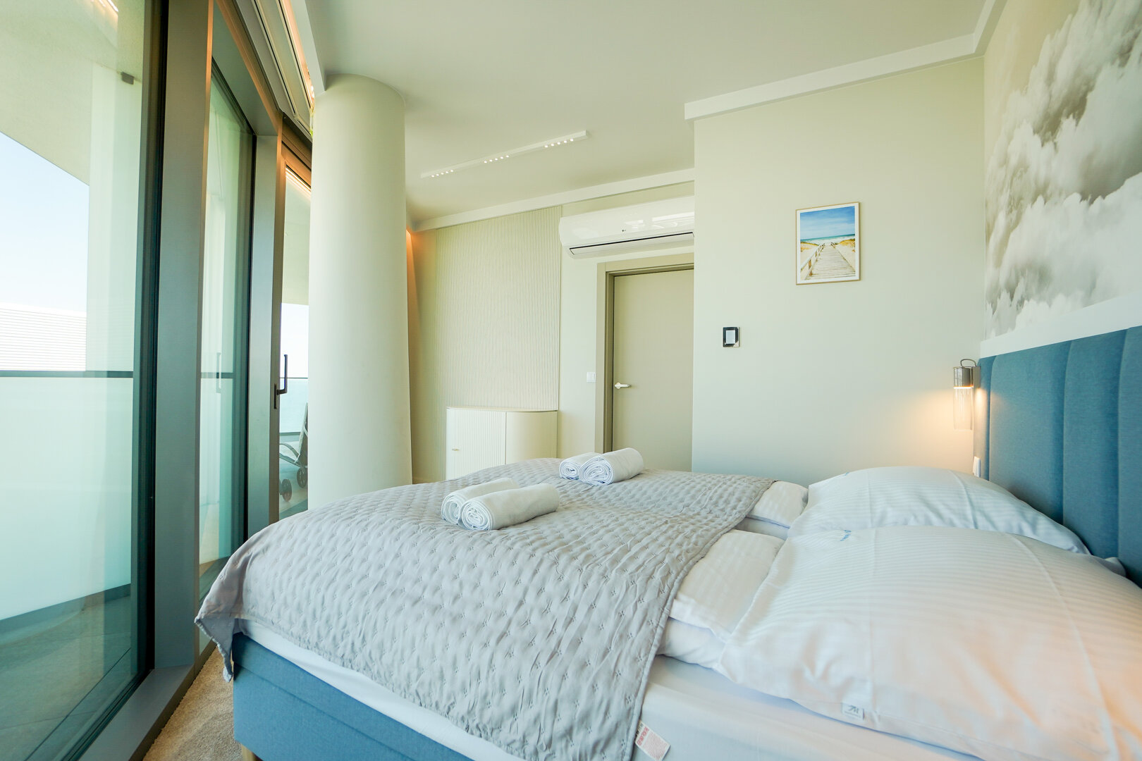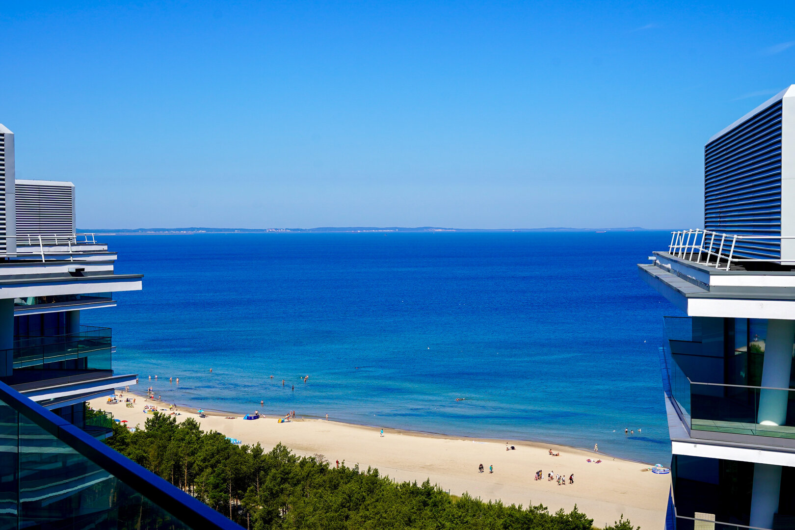 Wyjątkowy apartament premium położony na ostatnim piętrze budynku zachwyca pięknym, frontalnym widokiem na morze. Przestrzeń została zaprojektowana z myślą o komforcie – dwie oddzielne sypialnie, elegancki salon z aneksem kuchennym oraz panoramiczne przeszklenia tworzą wnętrze idealne na rodzinny wypoczynek lub pobyt w gronie przyjaciół. Nowoczesne wyposażenie, balkon z widokiem na horyzont i najwyższe piętro gwarantują ciszę, prywatność i niezapomniane poranki z szumem fal w tle.
