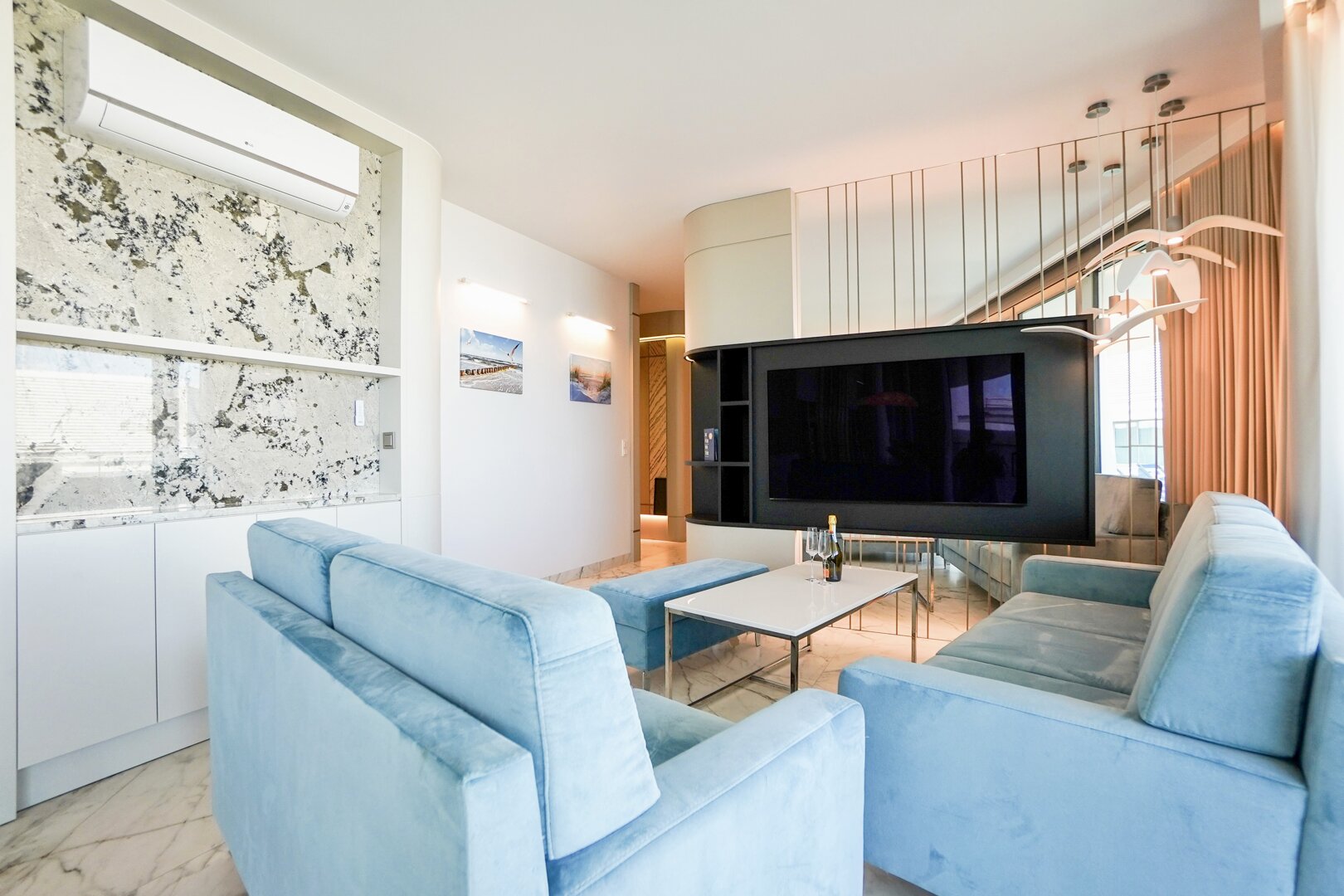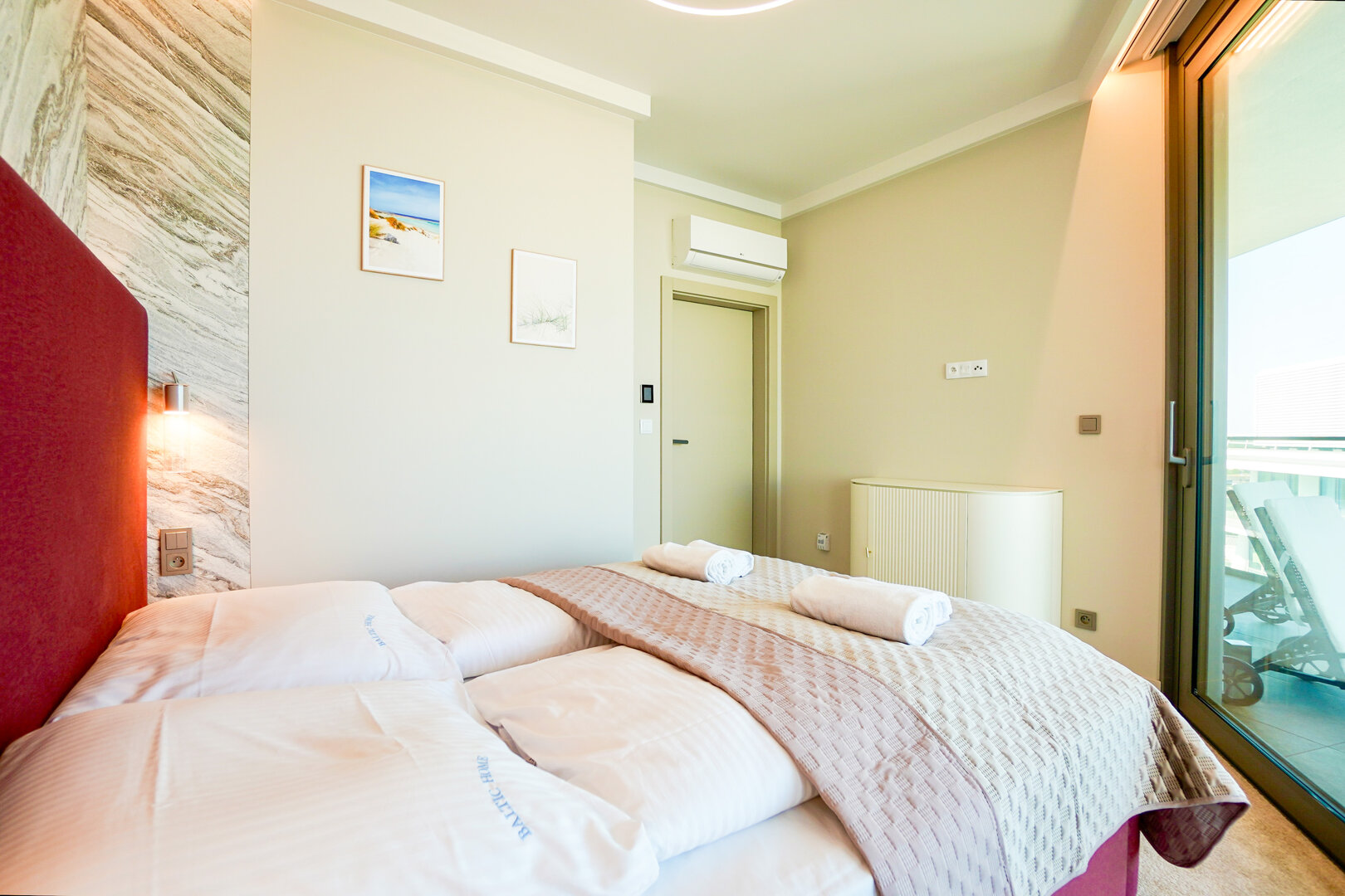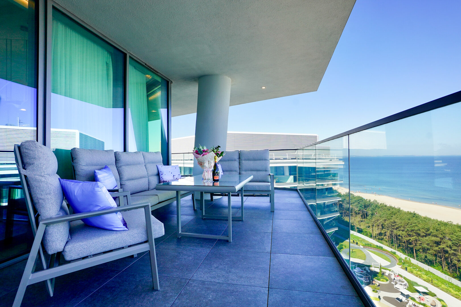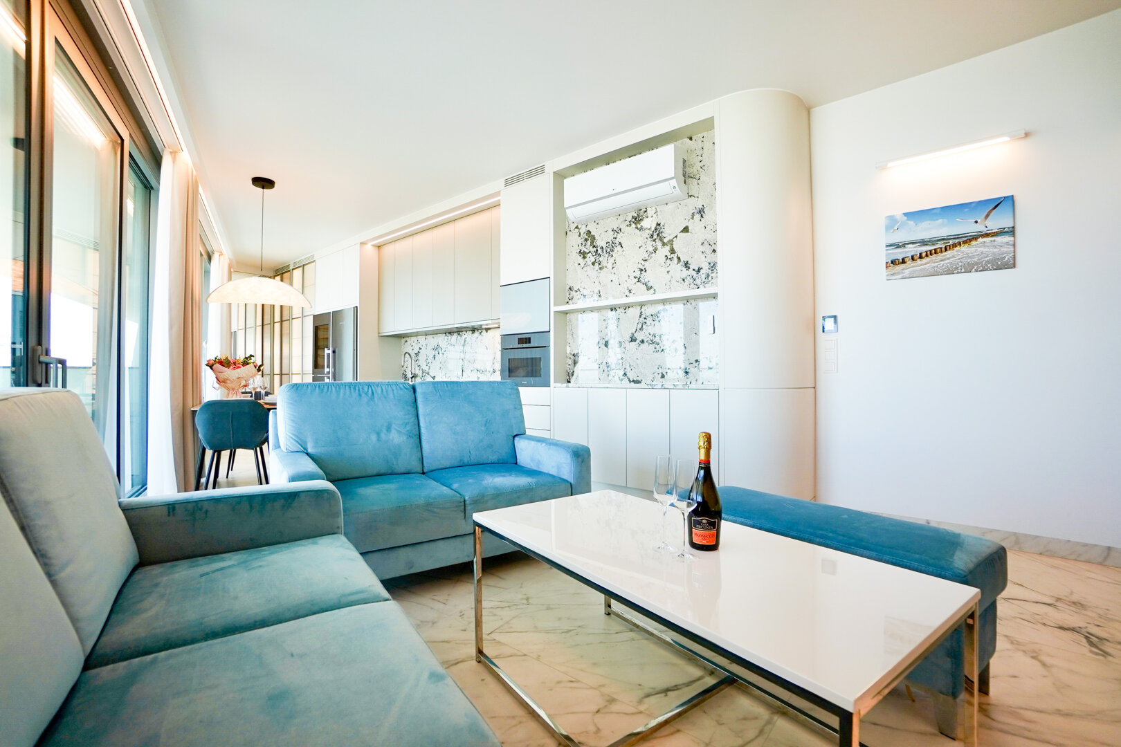 Wyjątkowy apartament premium położony na ostatnim piętrze budynku zachwyca pięknym, frontalnym widokiem na morze. Przestrzeń została zaprojektowana z myślą o komforcie – dwie oddzielne sypialnie, elegancki salon z aneksem kuchennym oraz panoramiczne przeszklenia tworzą wnętrze idealne na rodzinny wypoczynek lub pobyt w gronie przyjaciół. Nowoczesne wyposażenie, balkon z widokiem na horyzont i najwyższe piętro gwarantują ciszę, prywatność i niezapomniane poranki z szumem fal w tle.