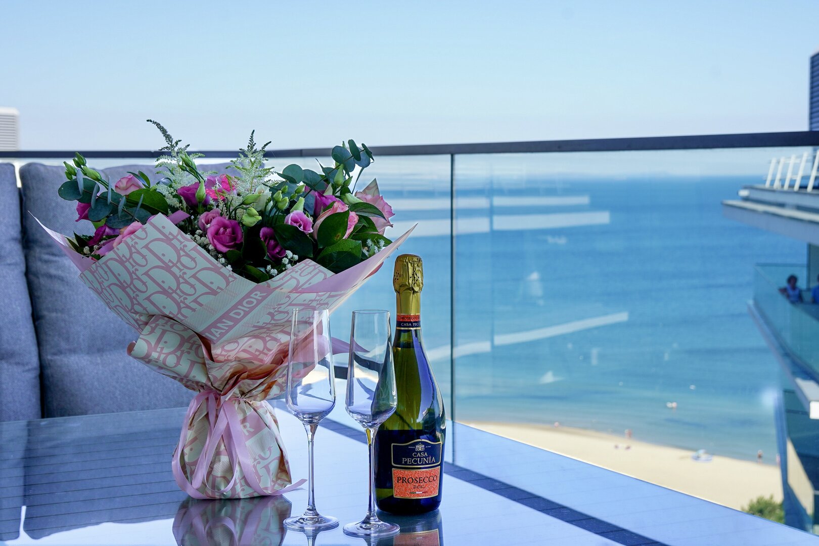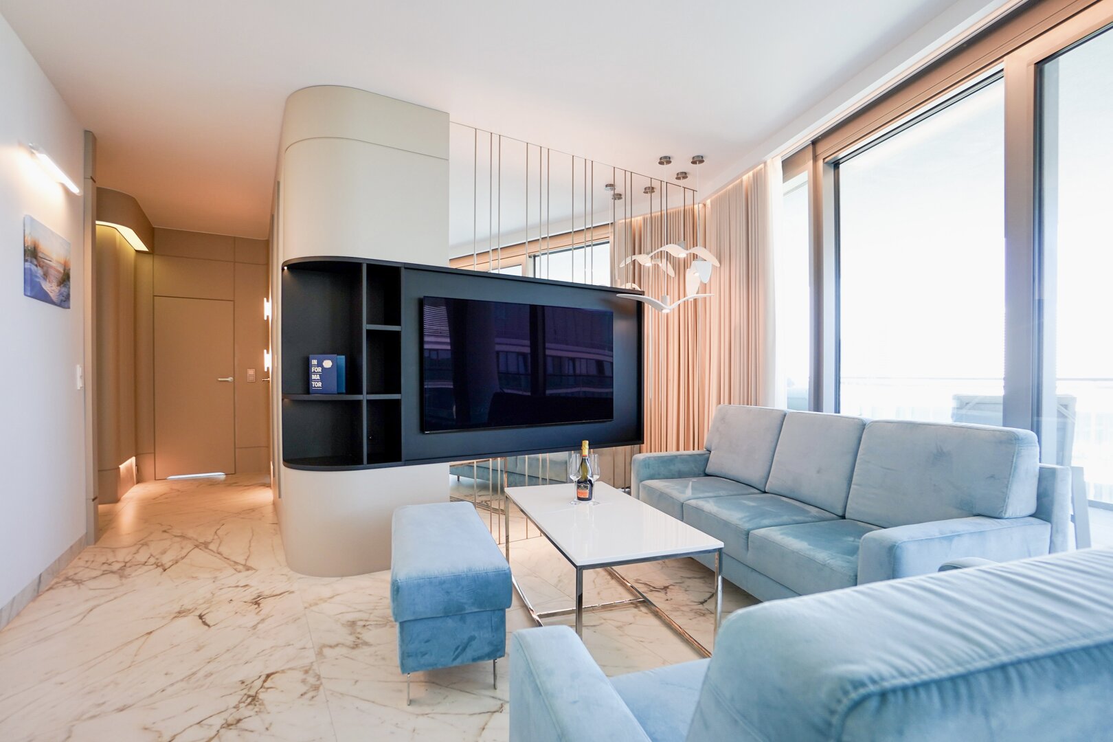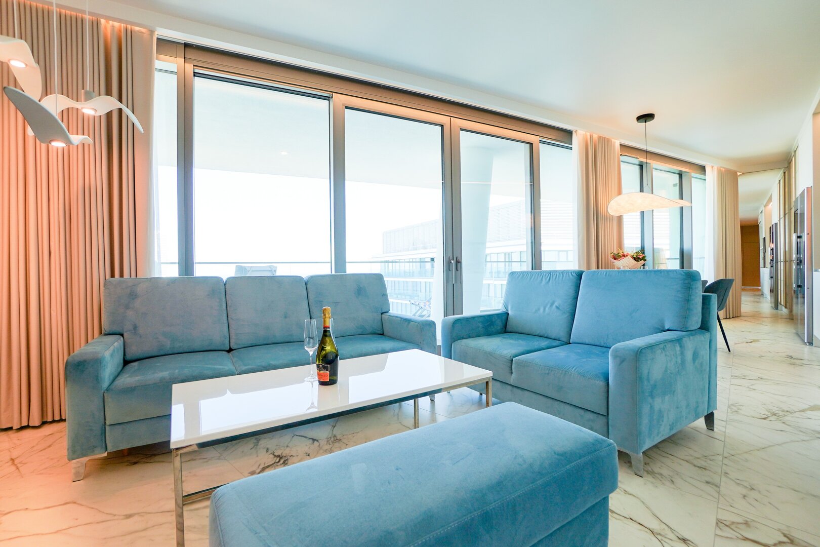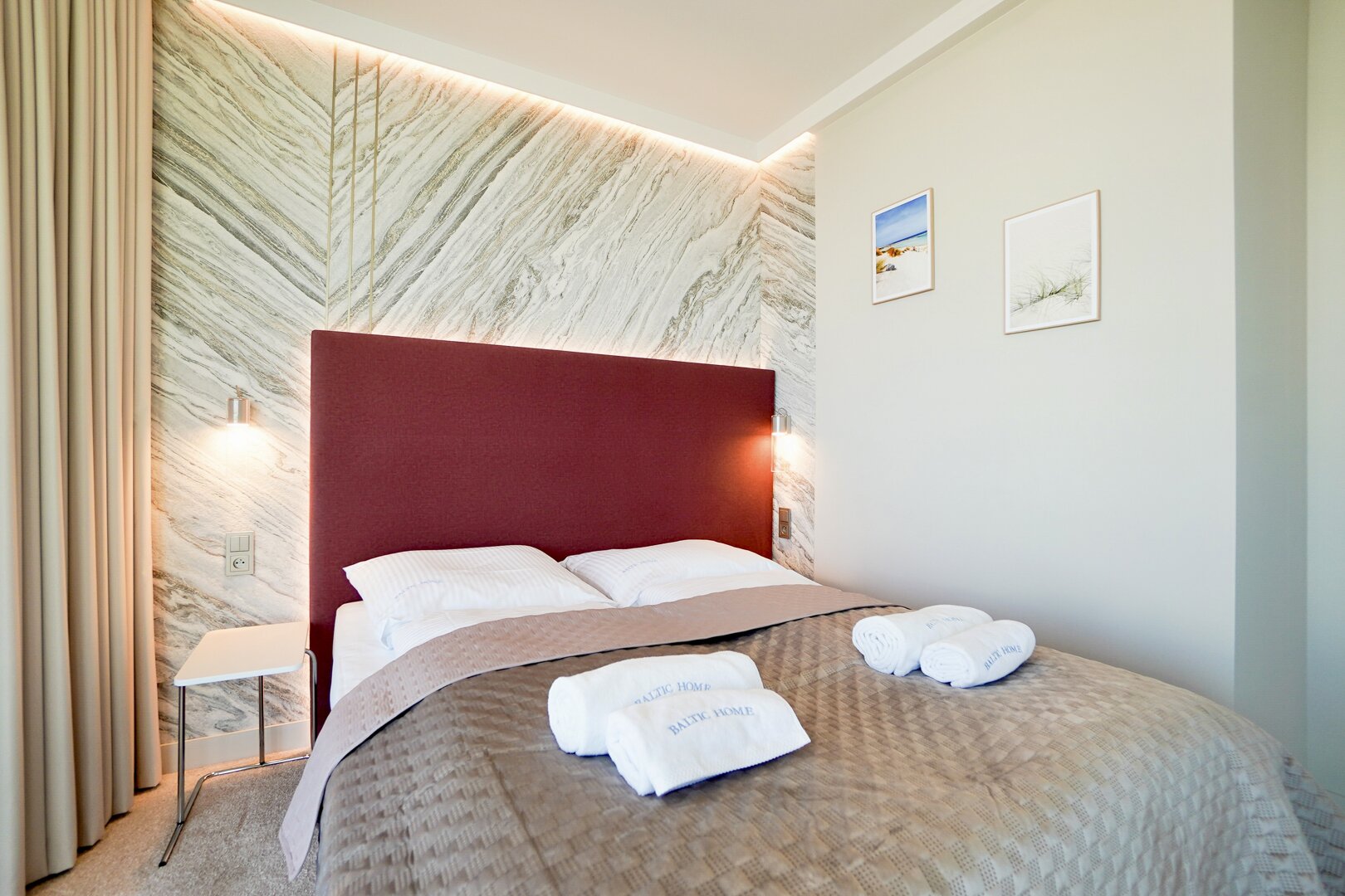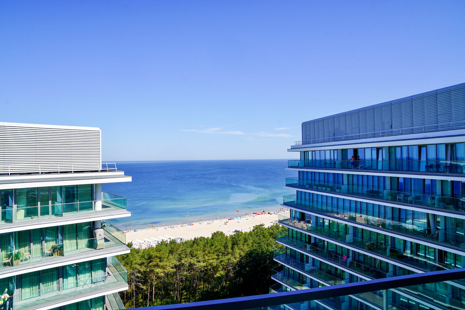 Wyjątkowy apartament premium położony na ostatnim piętrze budynku zachwyca pięknym, frontalnym widokiem na morze. Przestrzeń została zaprojektowana z myślą o komforcie – dwie oddzielne sypialnie, elegancki salon z aneksem kuchennym oraz panoramiczne przeszklenia tworzą wnętrze idealne na rodzinny wypoczynek lub pobyt w gronie przyjaciół. Nowoczesne wyposażenie, balkon z widokiem na horyzont i najwyższe piętro gwarantują ciszę, prywatność i niezapomniane poranki z szumem fal w tle.