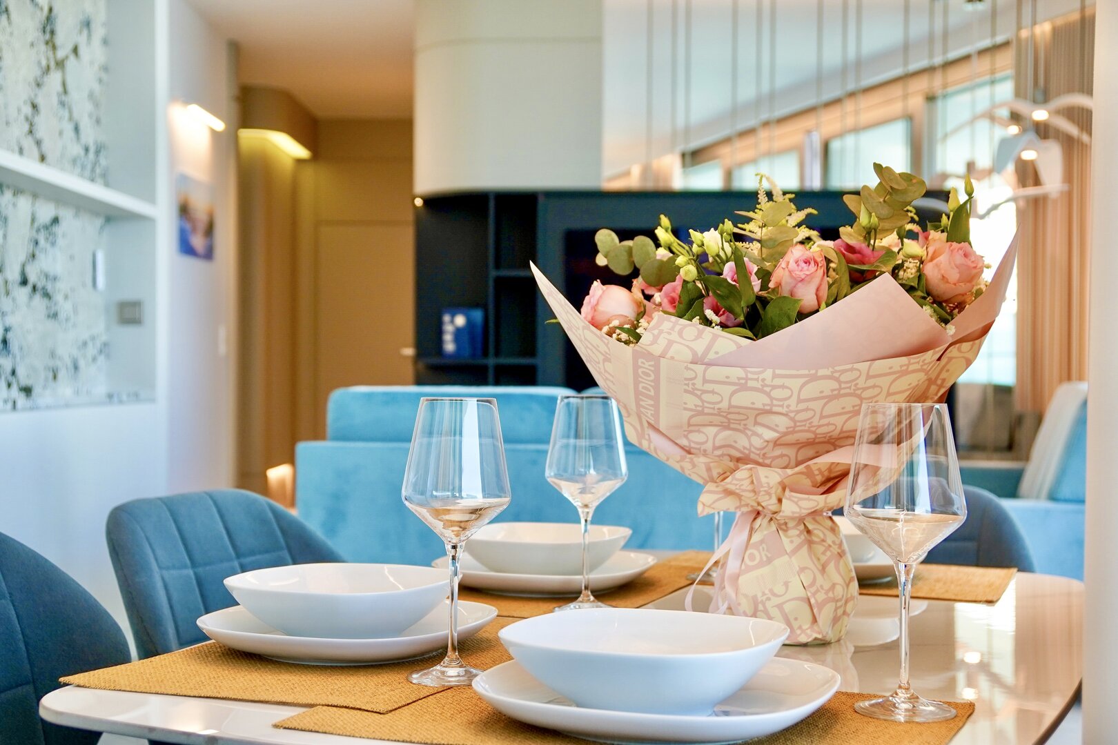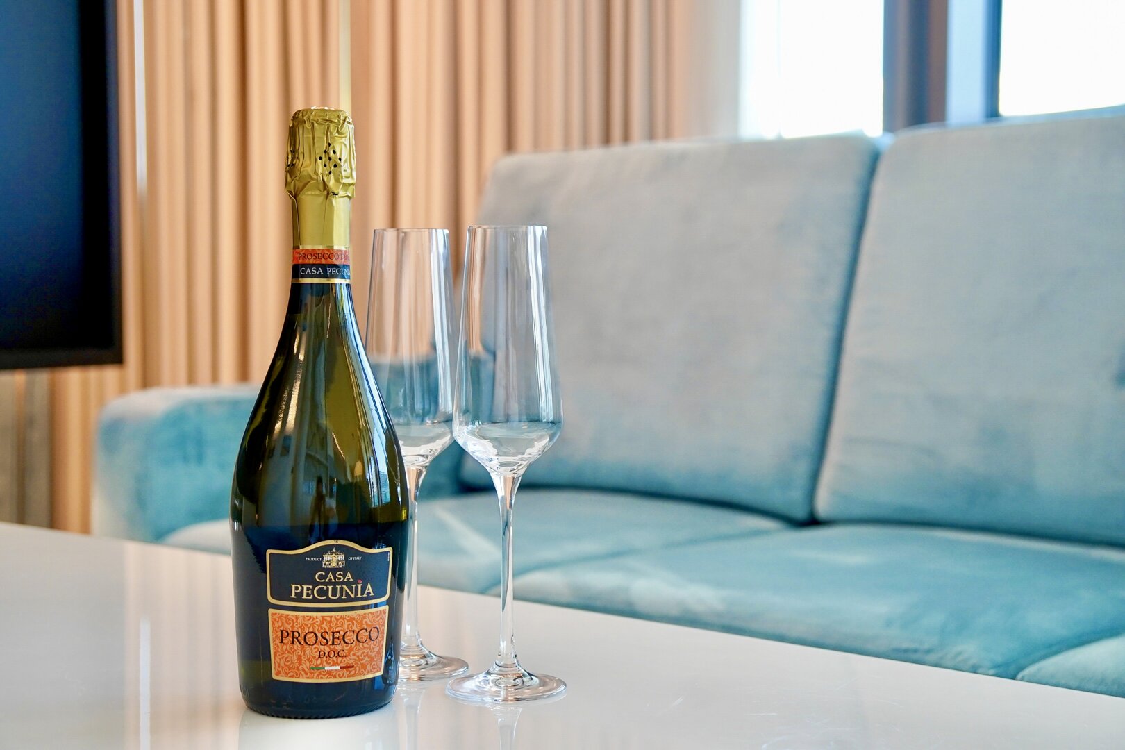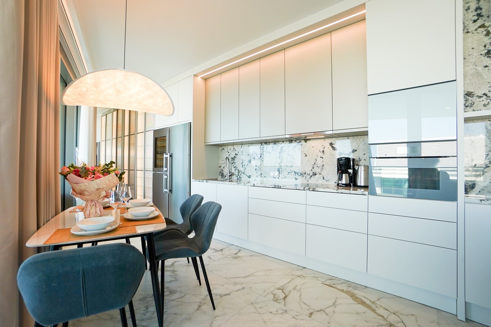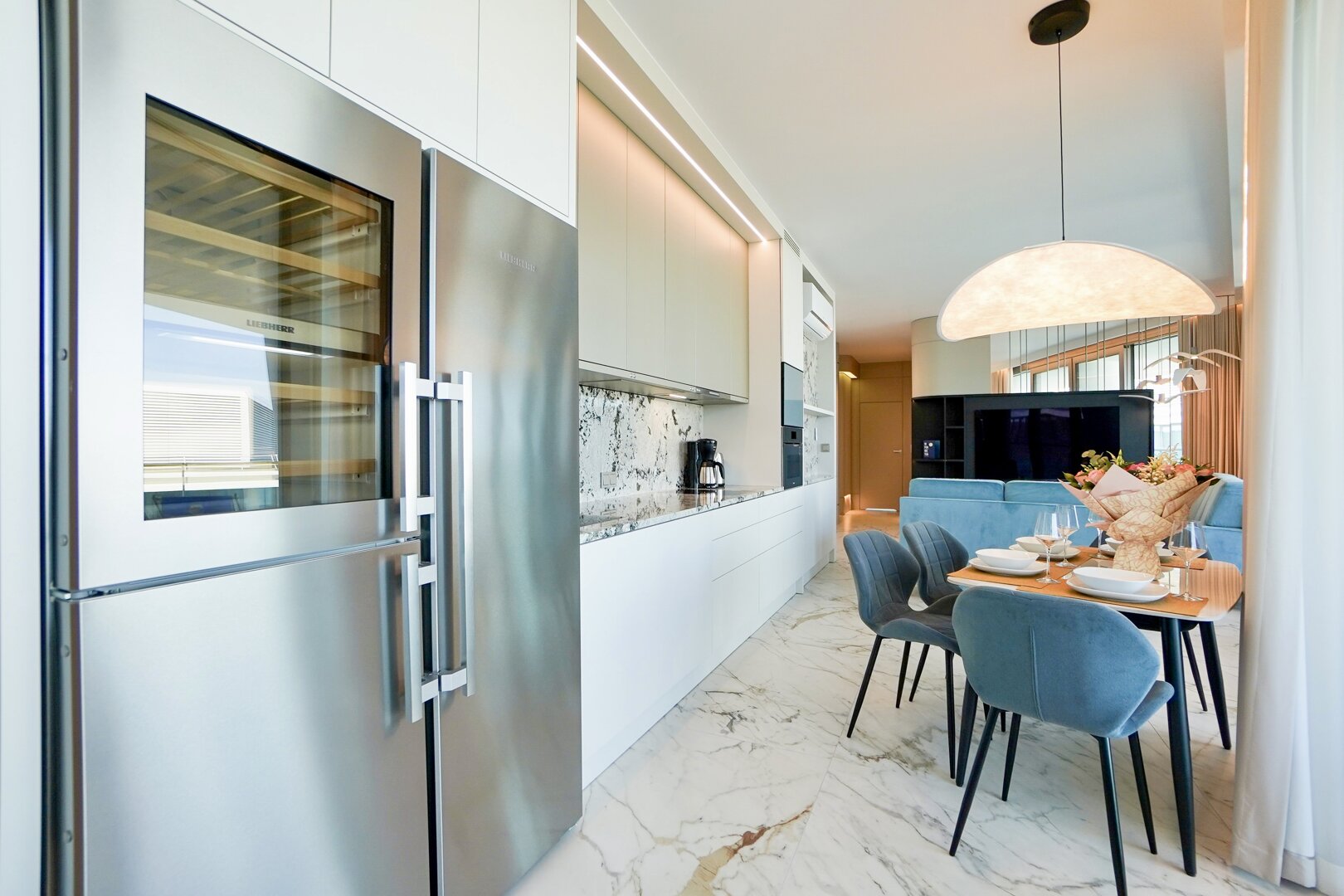 Wyjątkowy apartament premium położony na ostatnim piętrze budynku zachwyca pięknym, frontalnym widokiem na morze. Przestrzeń została zaprojektowana z myślą o komforcie – dwie oddzielne sypialnie, elegancki salon z aneksem kuchennym oraz panoramiczne przeszklenia tworzą wnętrze idealne na rodzinny wypoczynek lub pobyt w gronie przyjaciół. Nowoczesne wyposażenie, balkon z widokiem na horyzont i najwyższe piętro gwarantują ciszę, prywatność i niezapomniane poranki z szumem fal w tle.