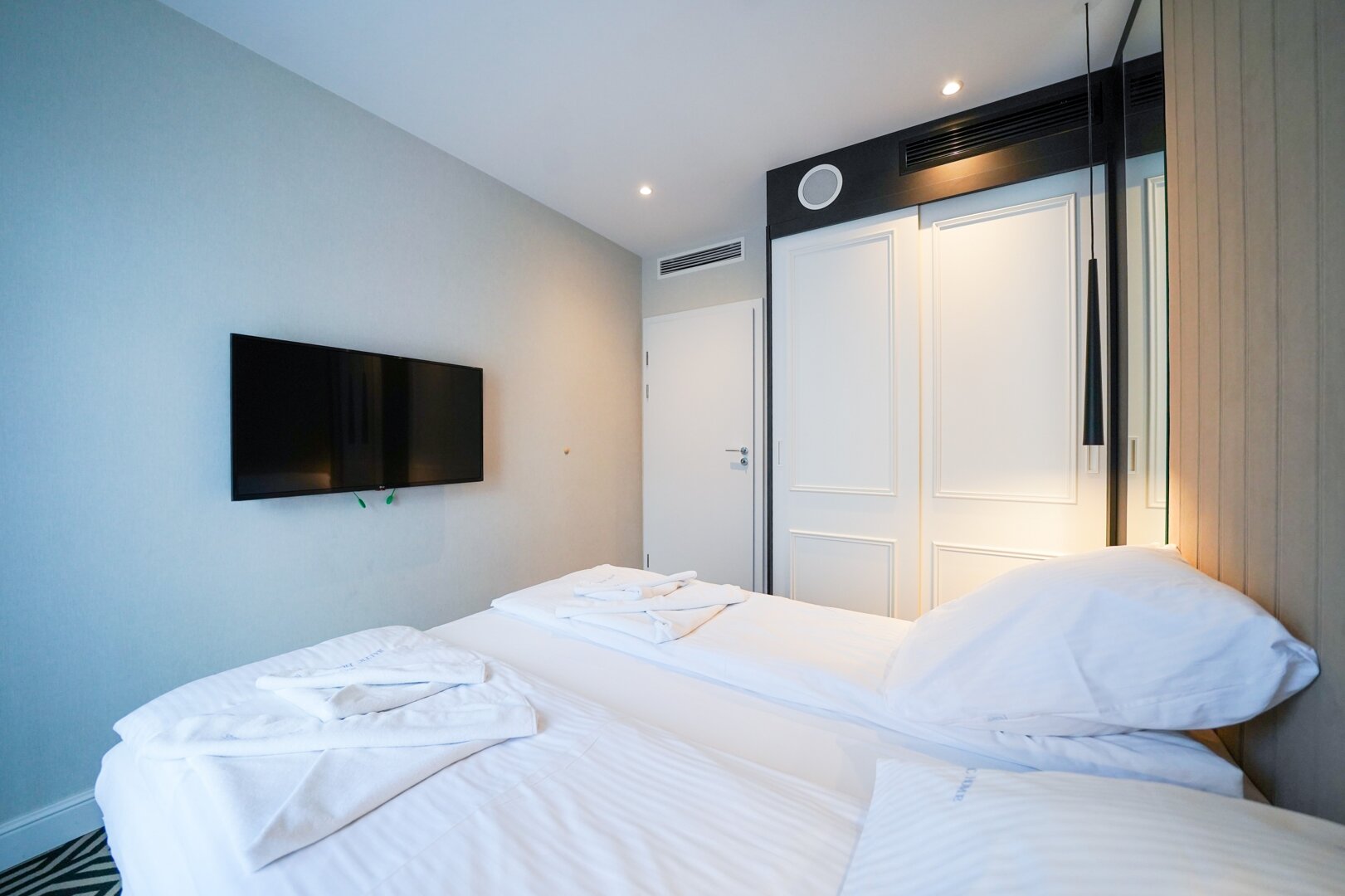 Apartament G406 to ekskluzywna przestrzeń w budynku o charakterystycznej brutalistycznej formie, położonym blisko plaży i centrum Świnoujścia. Wnętrza wyróżniają się wysokim standardem wykończenia, miękkimi wykładzinami i starannie dobranymi detalami. Składa się z eleganckiej sypialni, salonu z aneksem kuchennym oraz nowoczesnej łazienki. Balkon zapewnia dodatkową przestrzeń do relaksu. To idealne miejsce dla rodzin i grup znajomych ceniących wygodę i styl. Na terenie obiektu dostępne są miejsca parkingowe – wymagana jest wcześniejsza rezerwacja.